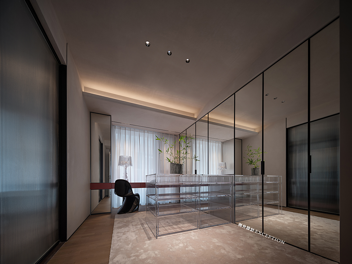 那些隱匿于空間背后的故事,在流動的風(fēng)里,在精致有品的器物里,也在平淡有序的日子里。衣帽間做了大量的全身鏡,里面是衣柜,配合玻璃柜門的衣柜,實現(xiàn)功能和美學(xué)的雙重享受,亞克力島臺為穿搭時刻提供了最直觀的選擇,每天的精神風(fēng)貌都是鮮活而獨特的。