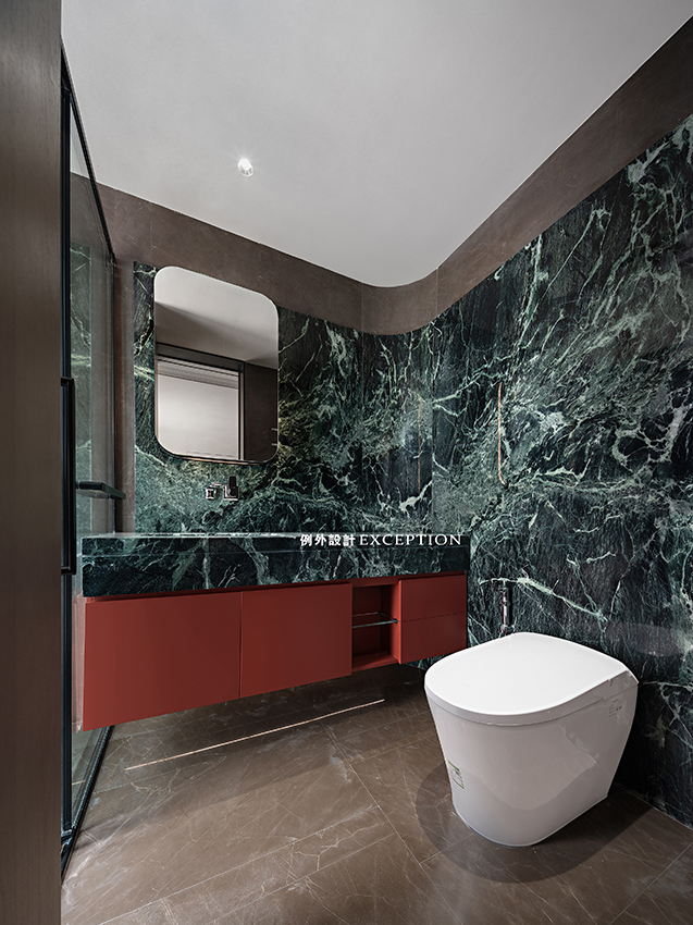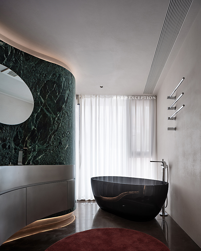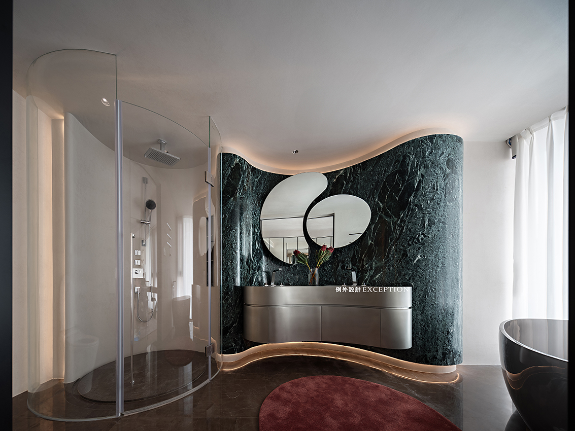 整體的弧形造型弱化了柱體的影響,空間是流動的,大理石背景上鑲嵌了異型的鏡柜,和設(shè)計師定制款純不銹鋼臺面搭配起來,一氣呵成,視覺上形成一種動態(tài)有力的美感。一幅小畫成為空間的視覺焦點,弧線與靈動的色彩協(xié)同敘事,在明亮通暢的空間里留下頗具藝術(shù)感的氛圍,是屬于屋主特有的生活品位。