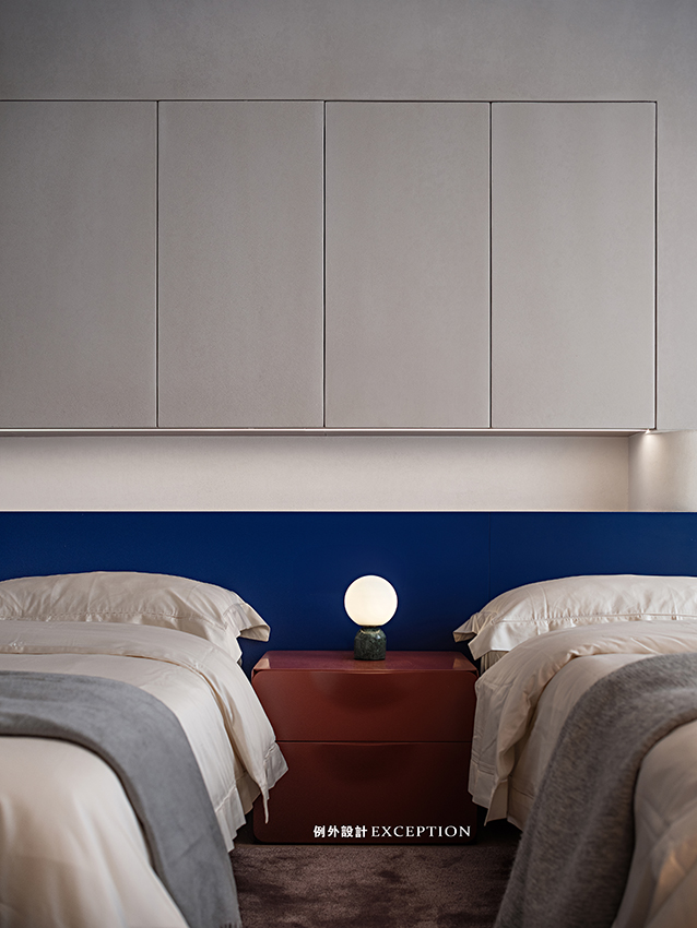 男孩房套房分為睡眠區(qū)、書房、衛(wèi)生間三進式結(jié)構(gòu),通過推拉門展開書房和睡眠區(qū)兩種不同的生活場景,界而未界。自由的尺度,多元的生活場景是私享空間最直白的詮釋,匹配男孩的喜好和個性,張弛有度的色彩與質(zhì)地考究的軟飾,烘托出純粹而安靜的空間氛圍。