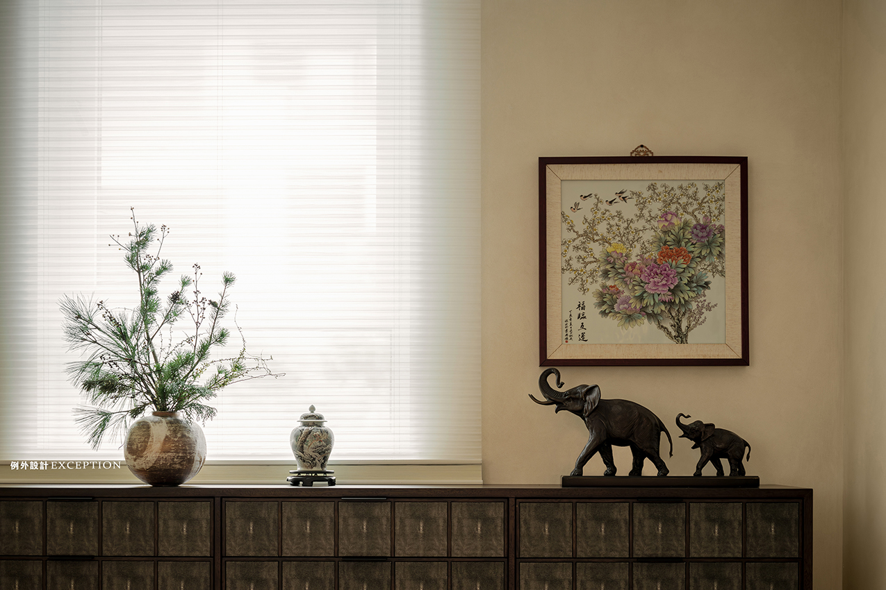 羅曼·羅蘭說:“藝術的偉大意義,基本上在于它能顯示人的真正感情、內心生活的奧秘和熱情的世界。”設計師將原有的露臺改造成女主人的書房,鉑金茶墩與3.6米實木長桌異常和諧,屋主會時常在這里喝茶、練習書法,文化的記憶與沉淀也在靜雅的環境中蔓延開來。