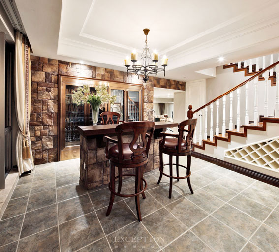 古典本與繁華的詩意共生,這盞鍛鐵吊燈卻在兼具復古優(yōu)美線條的同時將整體造型簡化,為這個休閑的私享領地注入靈動清新的氣息,華貴質感的皮質吧凳完美契合美式鄉(xiāng)村的自在灑脫,整個水吧區(qū)在大地系配色下凝練出沉穩(wěn)古樸的精神氣質。
