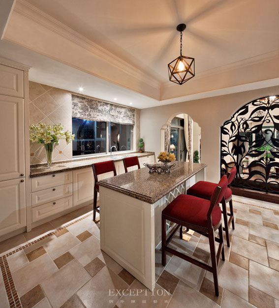 在廚房已有的照明基礎上,此時一盞簡單隨意的鐵藝吊燈便足以點亮這一室的氛圍,形似鉆石的立體幾何造型傳承了北歐血統(tǒng)的家居風格,細致精巧;吧椅椅面包覆飽滿而雍容的石榴紅布藝,讓大地色系的空間充斥著跳躍的溫暖。