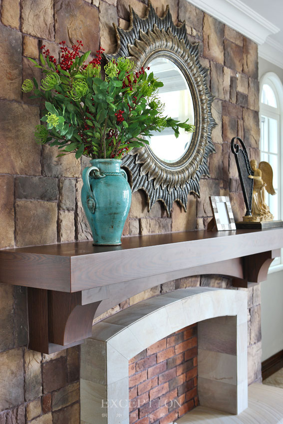 仿古太陽鏡似乎是壁爐造型區(qū)的標配,當然為配合背后的仿古文化石,邊框金屬的選擇應遵從低調復古的感覺,于是巧妙利用仿古銹描摹時光的韻味,以回憶的銅色承載當下的生活,濃濃的文藝氣息撲面而來。