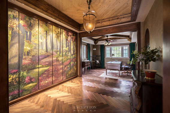 書房與主臥之間的過廳衣柜手繪畫將森林和花園引入空間,加上燈光的點(diǎn)綴,美得不可方物。在書房閱讀與辦公的間隙,瞟一眼美好的畫面,身心瞬間放松。