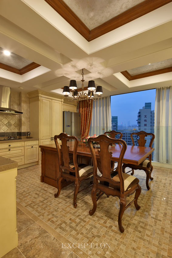 咖色實木銳化了十字橫梁,在傳承簡歐精髓的同時改善了原機構的不足;島臺與餐桌自成一系,交織著烹飪與美味的幸福。