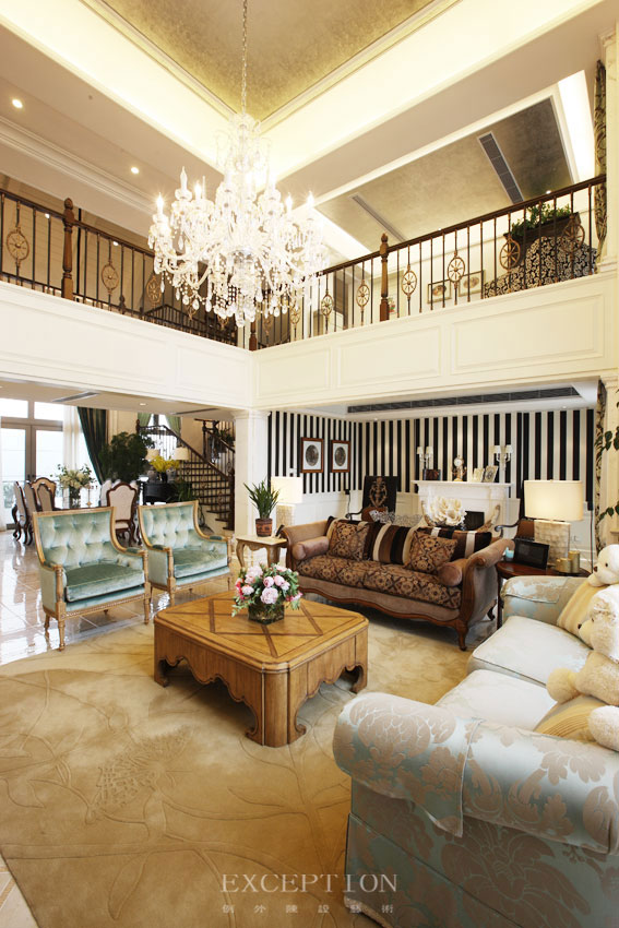 客廳的設計體現出整棟房子的簡歐風格,從上往下,硬裝都是以白色為主調,鐵藝的護欄上隔三岔五的裝飾著橢圓的花瓣,簡約中襯出優雅。