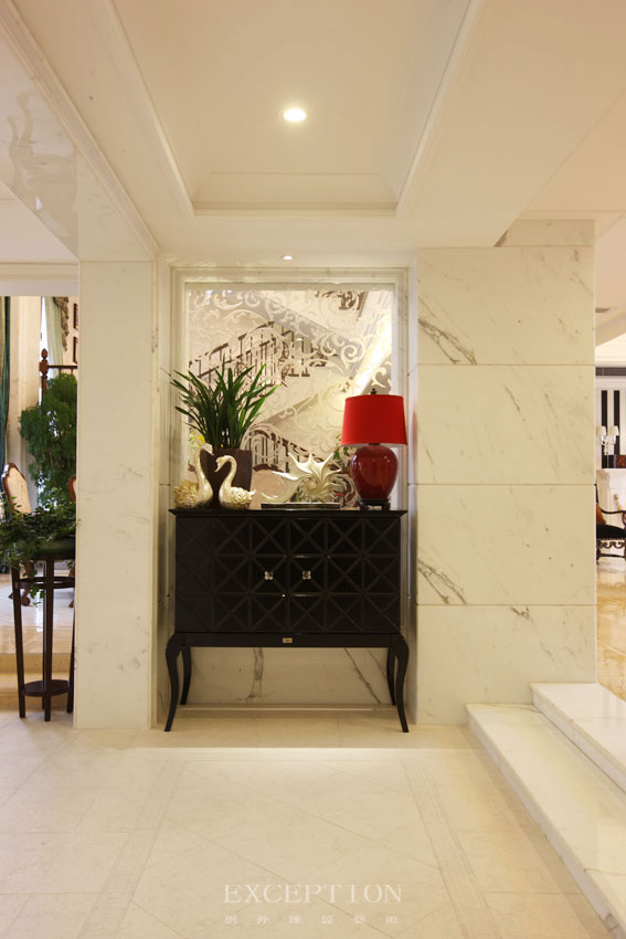 玄關設計承接房子的整體色調,以白色為主,黑色的裝飾柜不失為濃墨重彩的一筆,醉是那柜臺上那一抹嫣紅,和著旁邊的綠色植物以及陶瓷鵝,厚重中迸發出活力。從玄關到客廳,雪花白大理石臺階過度自然,將兩個空間恰似無意地銜接在一起,增加了空間上的延續。