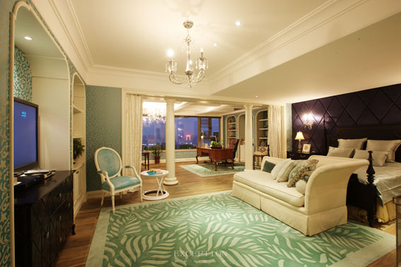 父母房的設計脫離了淺色的輕盈,少量的裝飾物更重視生活的實質需要,表現穩重的特性。而床頭的紫色絨布軟包則散發出一種高貴之氣,典雅之余,怡神靜氣。