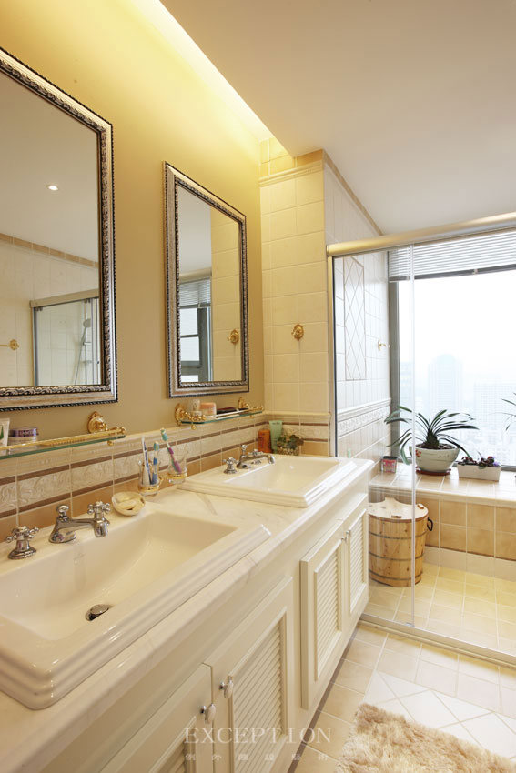黑白分明的色調,簡潔的線條勾勒出明朗的空間,貼心的雙人洗手池設計,方便主人夫婦二人的使用。