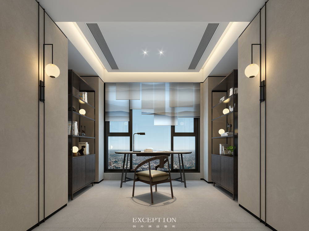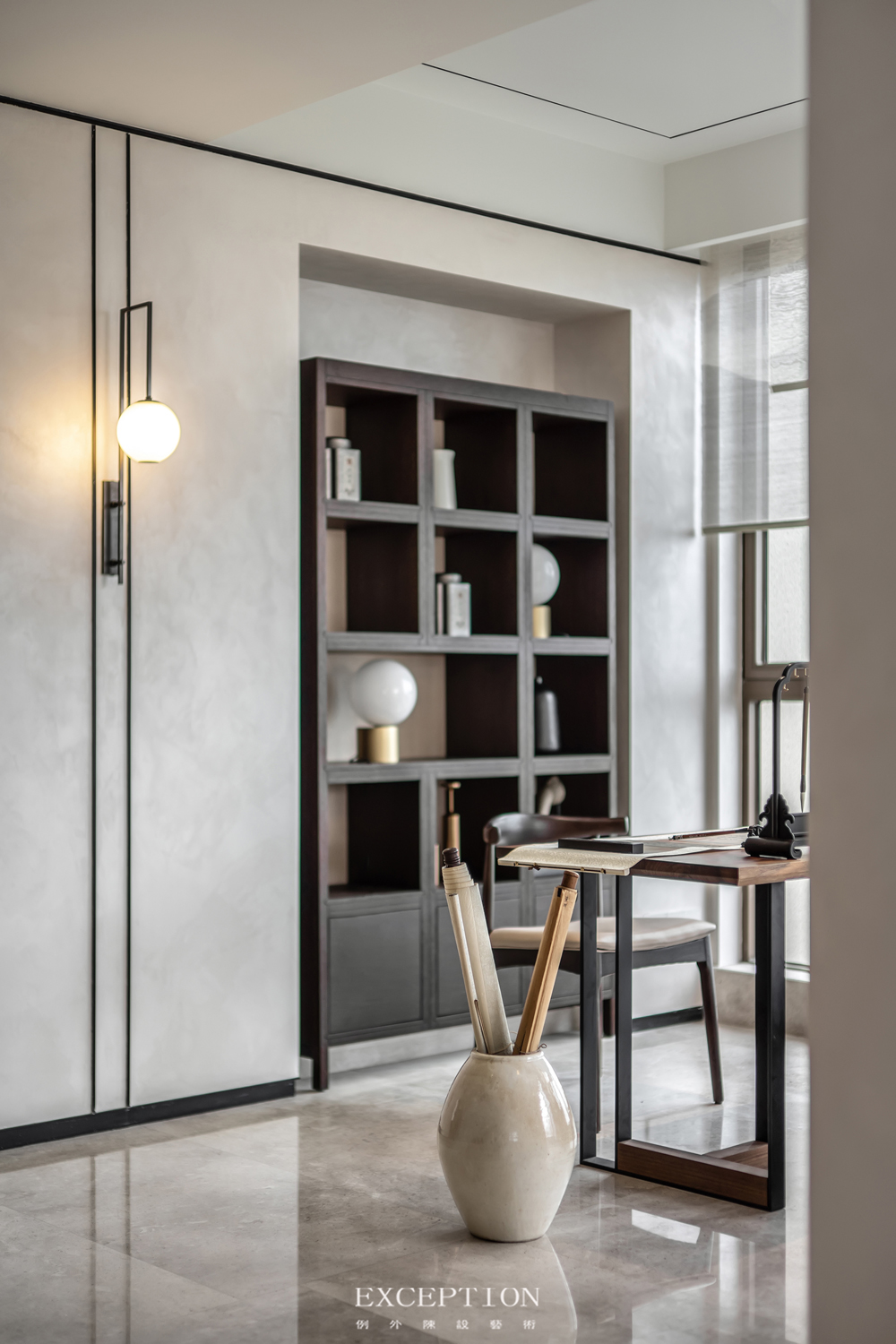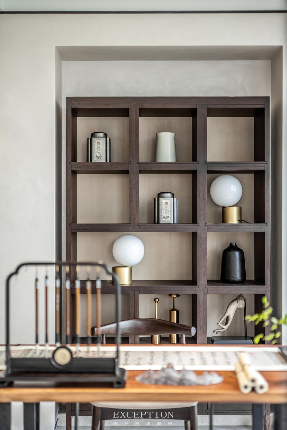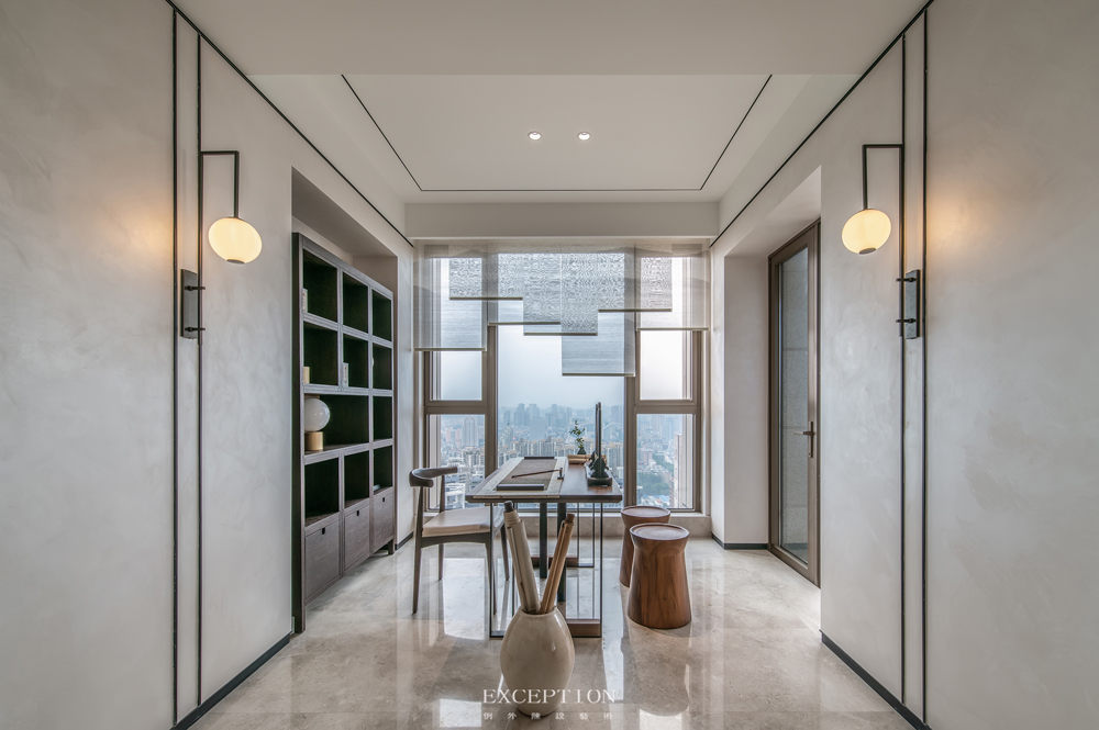 錯落層疊的山水掛簾,與窗外繁華城景對比糅合,仿佛寫意出海市蜃樓的朦朧之美。簡約的中式博古架與盈盈燈飾散發著簡美古樸的味道,清風入堂作伴,斜陽輝光漫灑,設計將書寫閱讀的場景搭建出婉約閑逸的意境美。