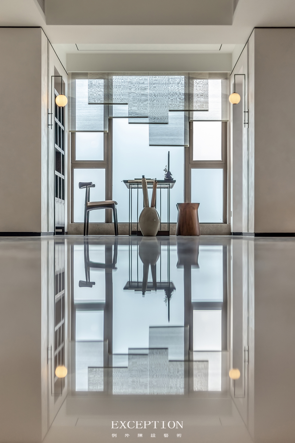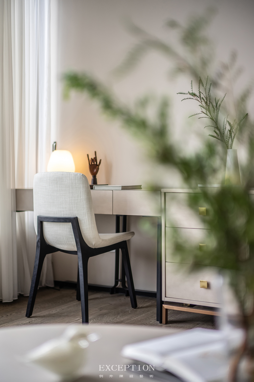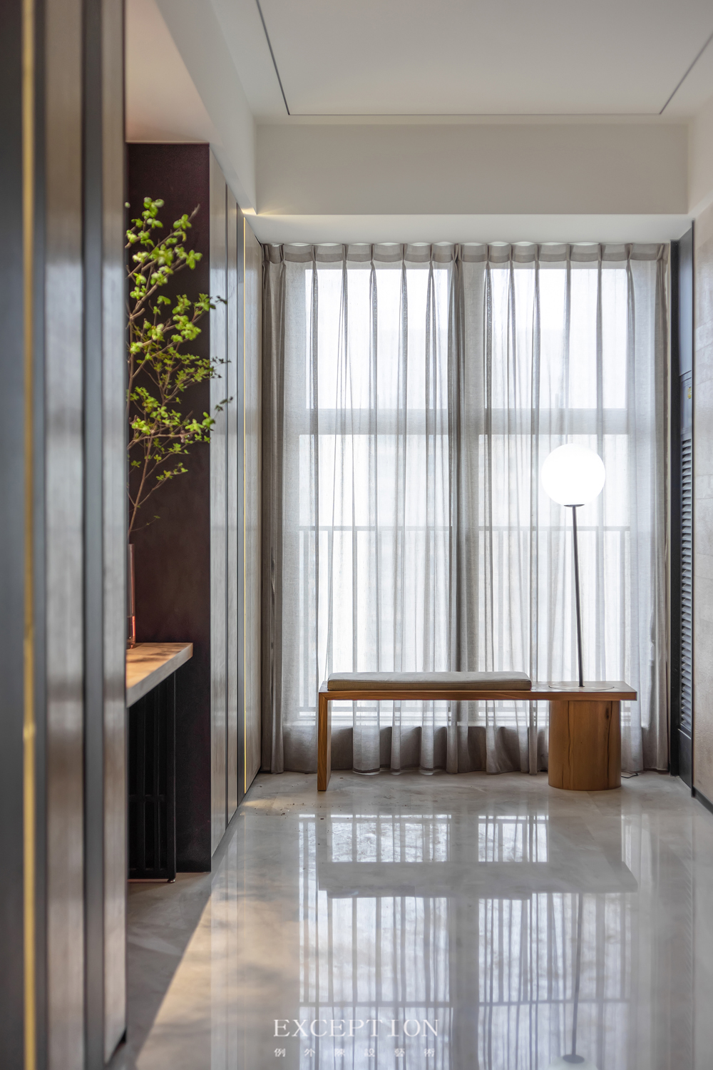 虛掩的紗簾、俏雅的花枝、奇特趣致的造型落地燈等室內簡單的軟飾陳設,既在美觀上營造出一層層傳統東方的風雅,其工藝品質亦經過設計師細致的考量及臻選,確保私宅空間精尚的格調品藝。