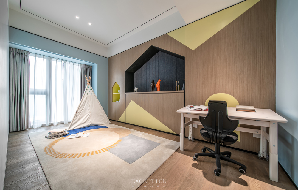 設計在主臥對門規劃了一間兒童房,在令孩子擁有自己獨立空間的同時,父母也能及時照顧到小朋友的一些需求。日間時分,孩子可以在寬闊的娛樂區里進行趣味的游戲玩耍,到了夜間,可以將收納于墻面的折疊床打開,搖身一變成為專屬的兒童臥室。