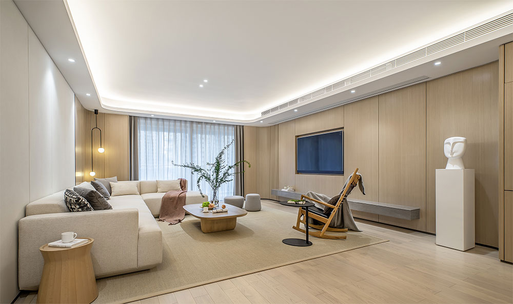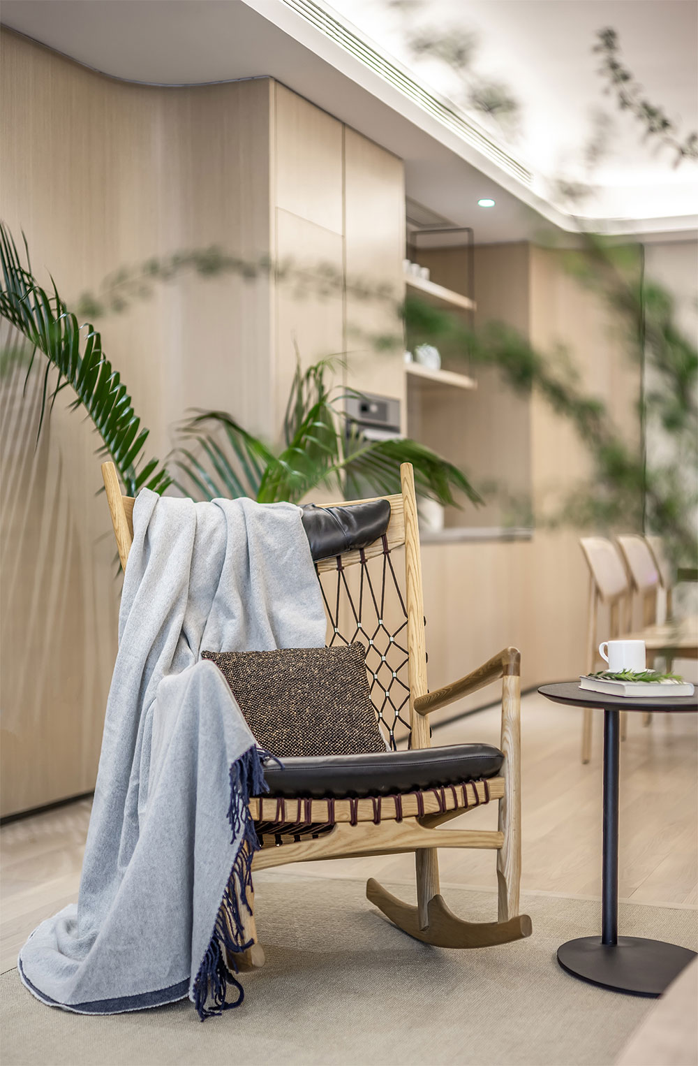 客廳以溫暖自然的木色和純凈柔和的米色搭建起交流休憩的日常生活場景,四周木色圓弧設計形成包容通暢的圍合感,肌理感劍麻地毯搭配斜紋沙發,串聯起有關理想生活的畫面,光著腳感受地毯帶來的massage效果,或是盤腿席地而坐,看書、聊天、和諧美好。