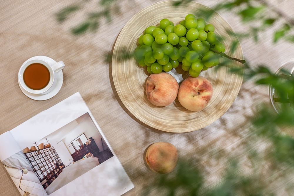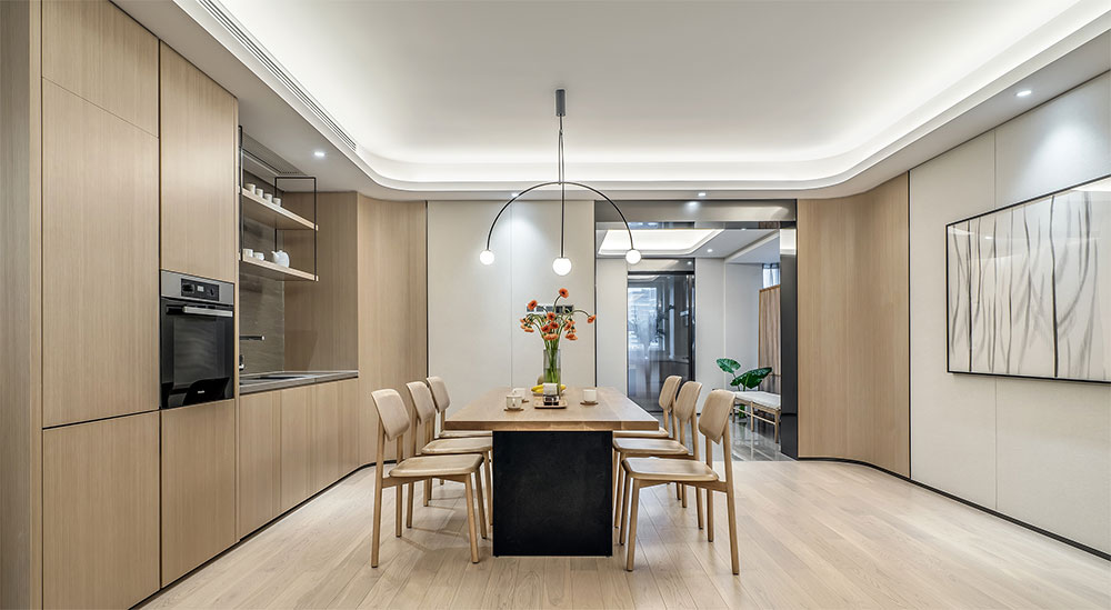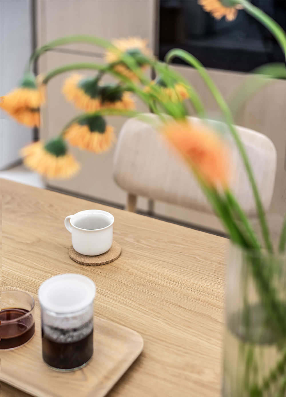 六人位長形餐桌延續就餐的儀式感,白瓷茶盞,玻璃花器,明麗的非洲菊,凝匯成金色的希望,與流淌的木色融為一體,在交談的話語中慢慢升溫,遠離都市的嘈雜,交織成靜謐清閑的幸福感。