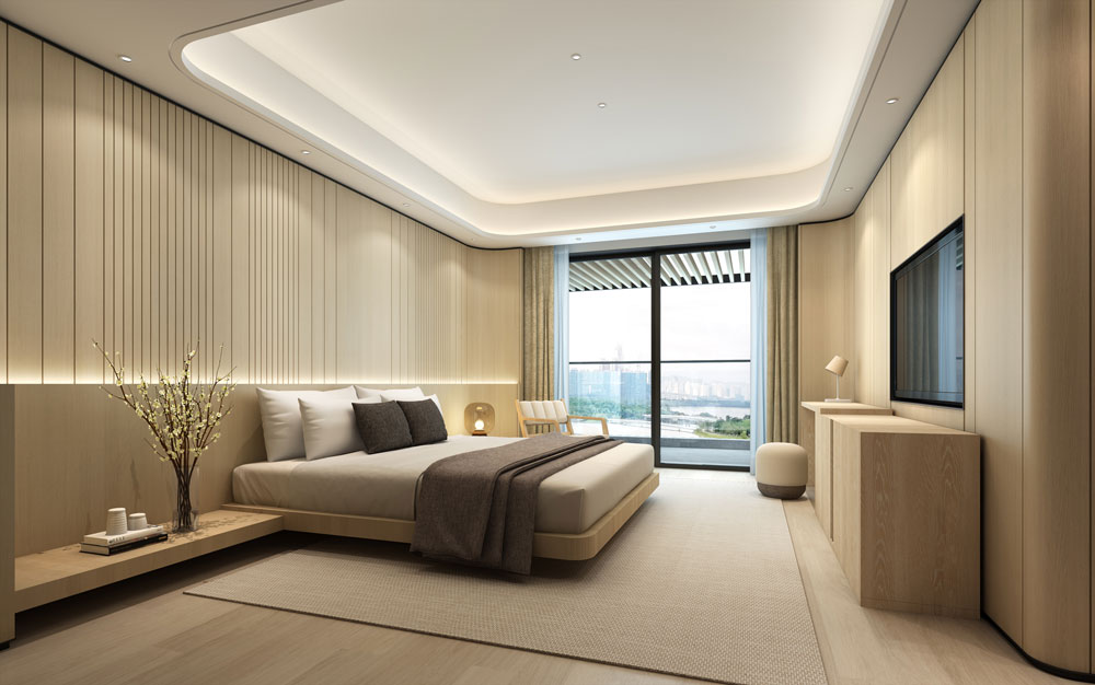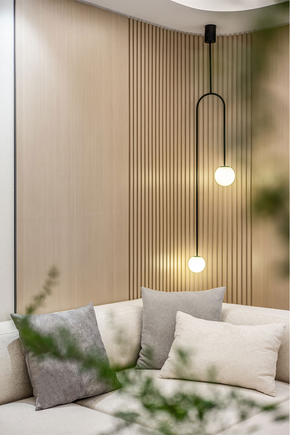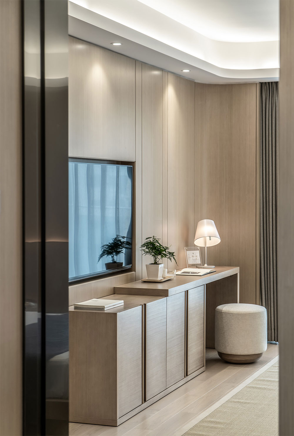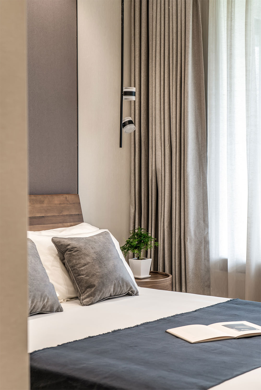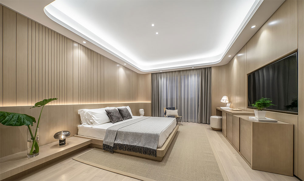 日本建筑師津端修一認為:“我們會做夢,所以我們目光長遠?!奔也粌H是一個供人睡覺的地方,更是見證居者品位追求,啟發人們向上的起點。在安靜的睡眠空間里,三兩枝青翠,活潑可愛,柔煦的燈光輝灑,清雅蘊藉,以一種盎然向上的姿態迎迓歸家的人。當居者進入放松的休憩狀態時,一枕清夢能喚起對家的深層次想象。