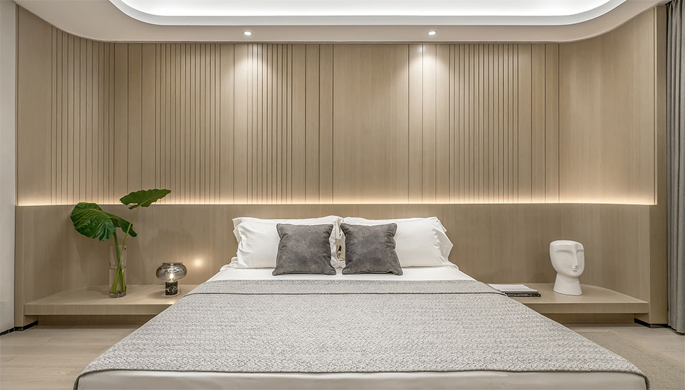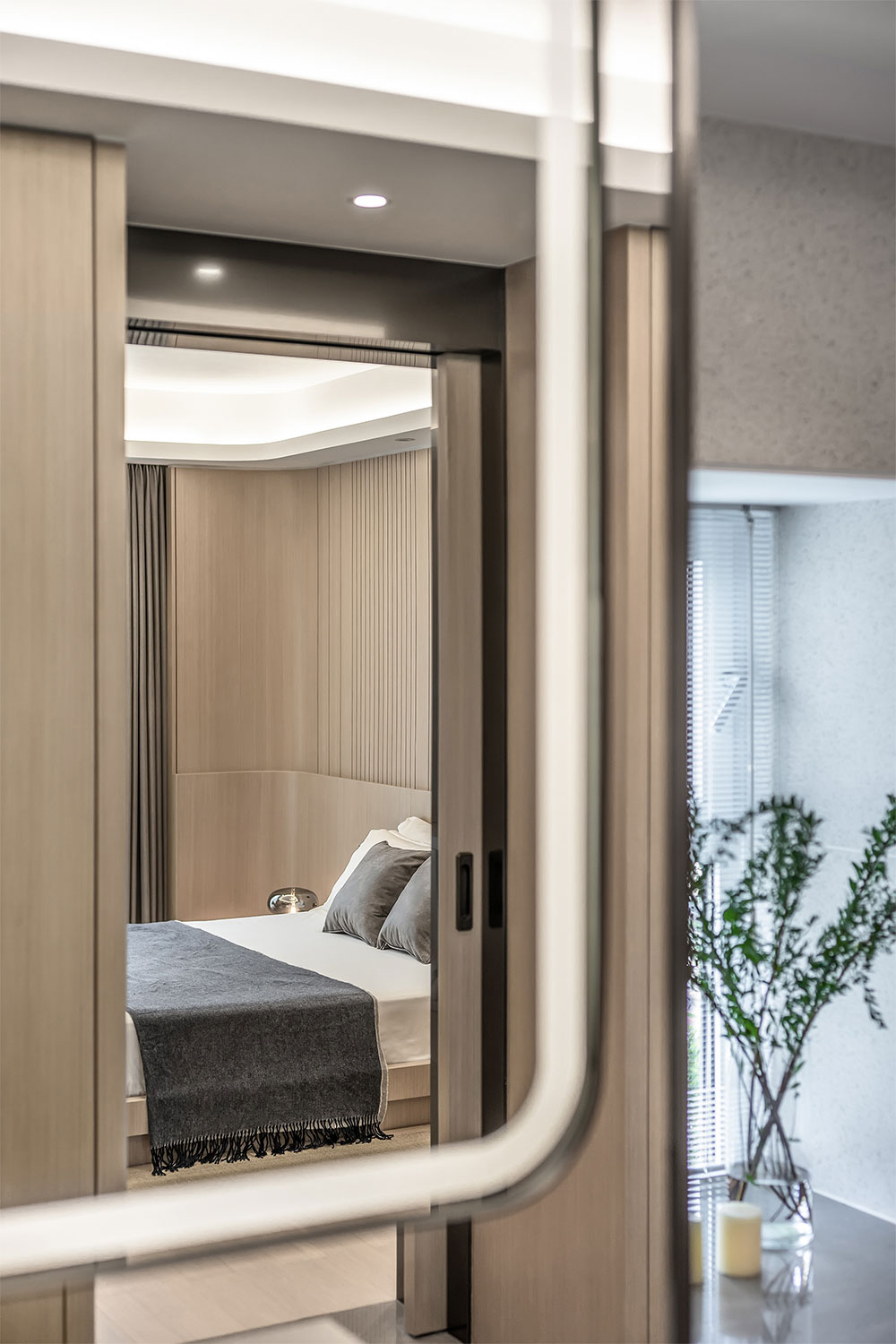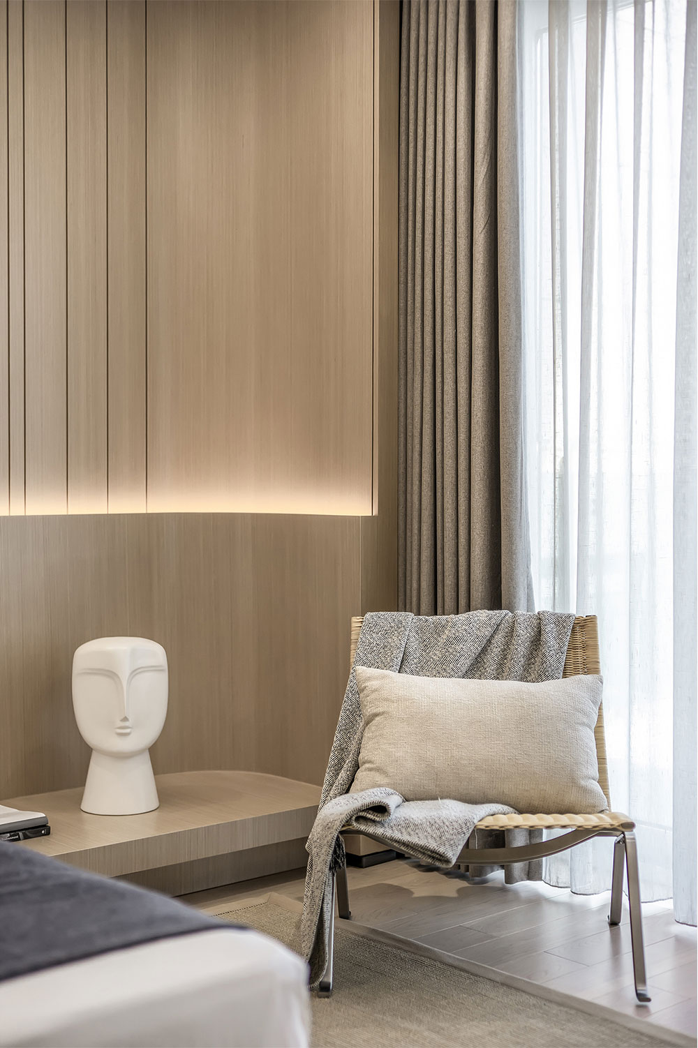 主臥延續客廳木飾面所營造的圍合性,溫暖如冬日的陽光。一體化床箱給予睡眠更多的安心感,棉質鋪就的灰色床品使人仿佛沉浸在白棉簇擁的懷抱中,不覺睡意漸濃。點點燈輝如星河萬千,時間被靜止,舒服又愜意。