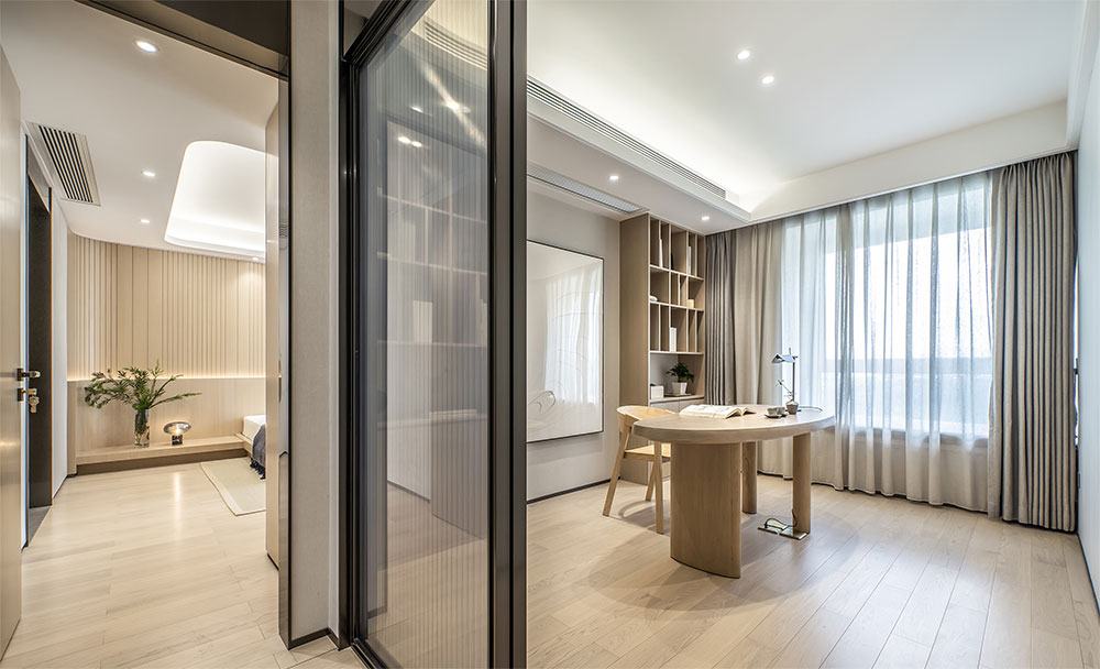 書房的掛畫是水波紋的剪紙畫,如同泉水叮咚流淌,光影、虛實,有著大自然的輕靈、曼麗和灑脫。書桌模擬了水滴的形態,流露出一種無聲而流動的美。在這里可以安靜地看書、寫字,周邊似有水流圍繞潤物無聲,鋪敘儒雅的魅力,一切都顯得純粹、詩意。