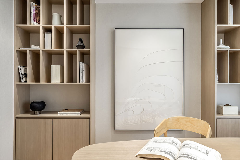 書櫥的設計著重細節,設計師鄭鴻始終將本次的設計重心定位于:輕松、自在的居住感。大小合適的間距讓書籍的收納更加方便,整體的造型也類似格柵的形狀,參差錯落,盡顯實用美學。