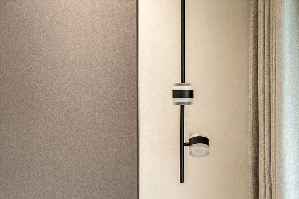 次臥清爽利落的黑白灰處理,讓空間透露清凈的起居哲學。灰色背景墻與床品仿若一體,立體而吸引目光。狀似管弦樂器的吊燈將藝術的氣息悄然點亮,積極的生活哲學告訴我們:只有內心輕盈,才能擁抱更多的希望。