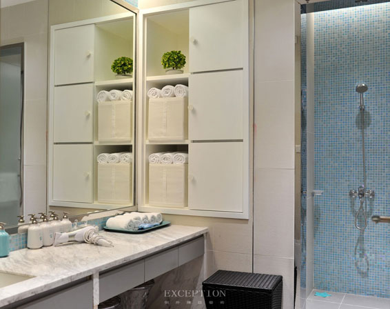 淋浴室,簡約現代家私搭配素凈的顏色,白與藍和諧配比帶來最柔和的視覺感受,塑造干凈健康的環境氛圍,讓媽媽們得以在最安心的環境下完成梳洗。