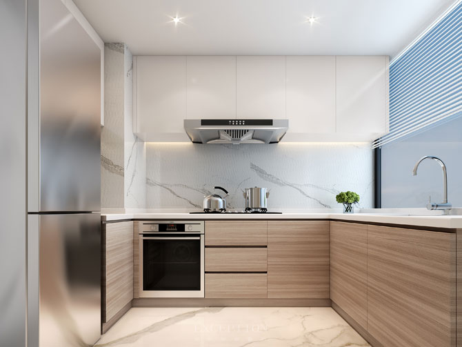 廚房主要著力點在色彩的選擇上,運用純潔明亮的白色,從視覺上營造通透的空間感。