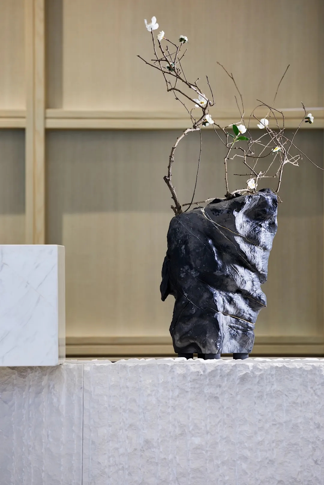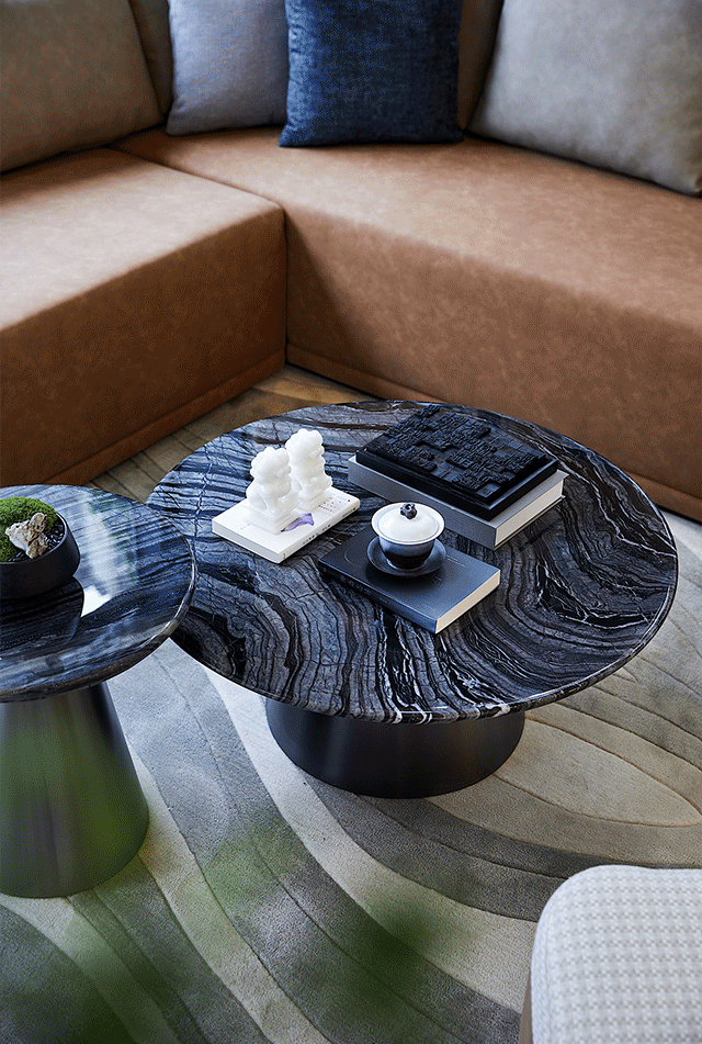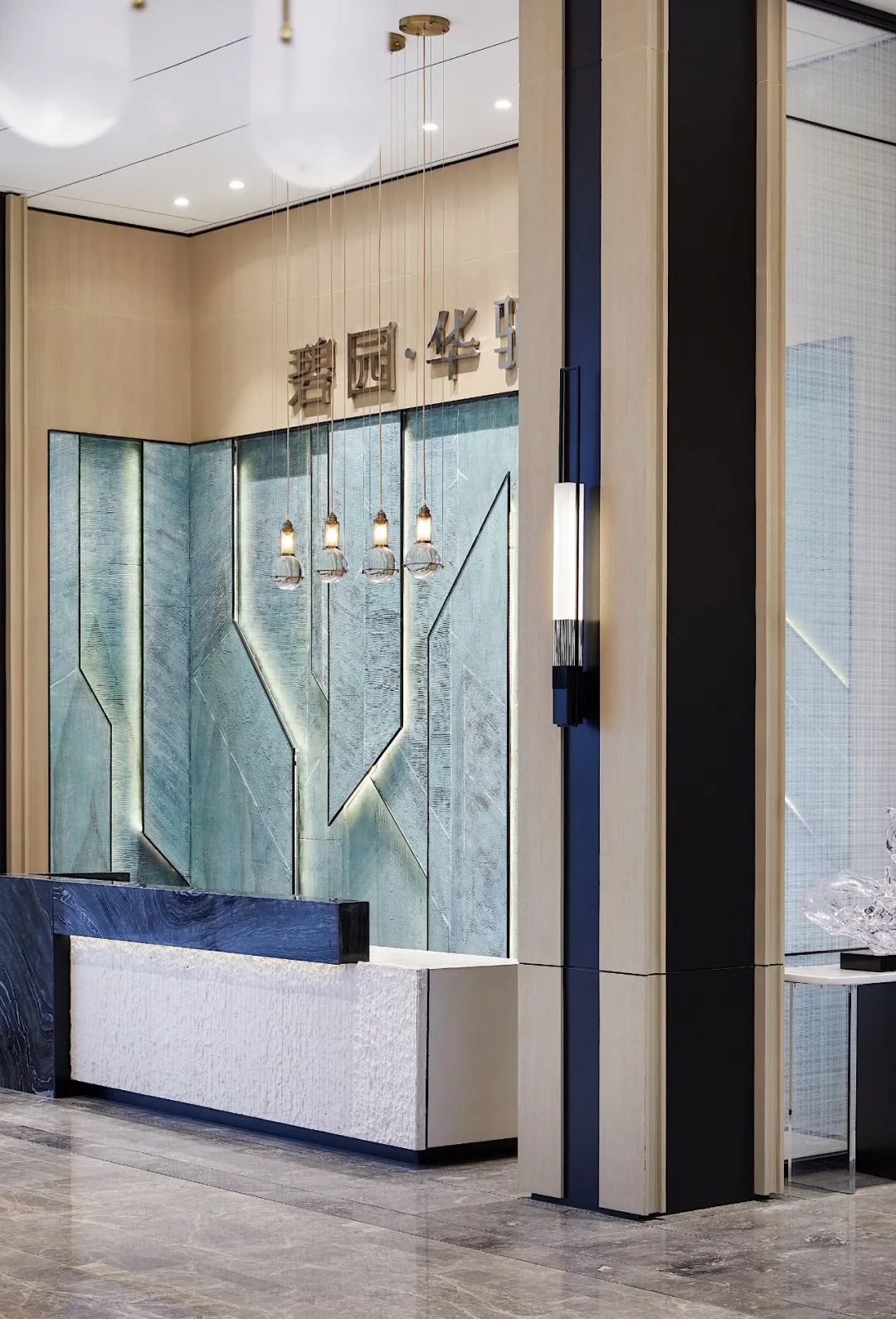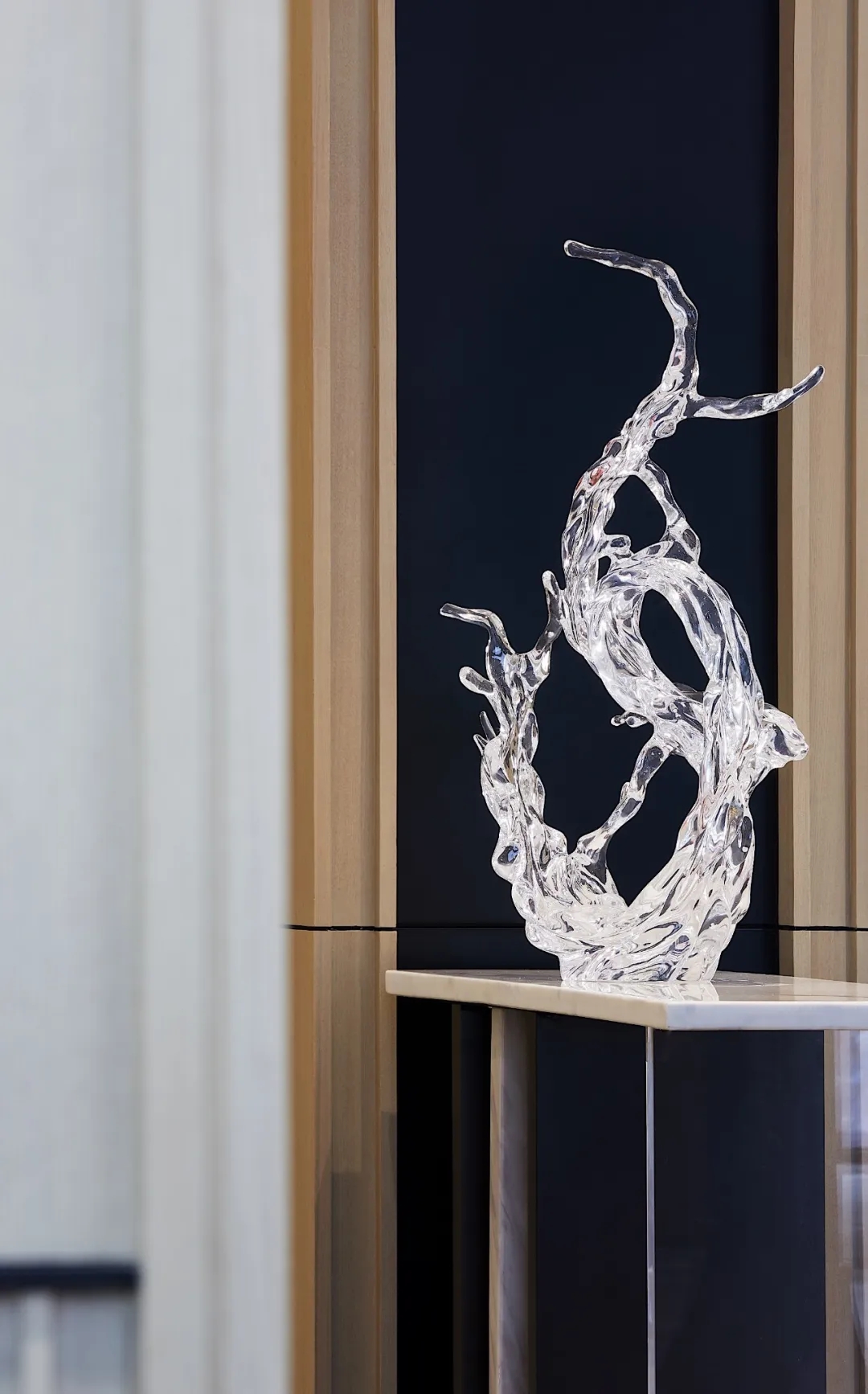 宛如湖景的碧色,與幾何線條的錯(cuò)落鋪排相融相生。一旁裝點(diǎn)的玻璃藝術(shù)品,以水花的柔美卓姿,寫意清透雅澹的意韻。空間在自然人文語素與現(xiàn)代極簡(jiǎn)形制的融合中,剛?cè)岵⑿睢?br />