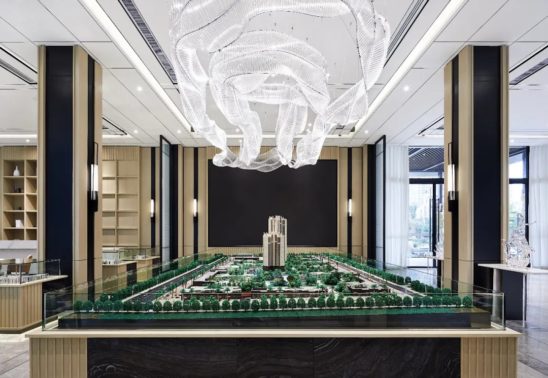 沙盤區(qū)的藝術(shù)吊燈,如云霧落入空間,又似漣漪圈圈散開,設(shè)計(jì)以現(xiàn)代手法演繹出山川自然的曠遠(yuǎn)與靈性、清幽與意趣,恰有一番“夫唯不爭(zhēng),而眾美紛至沓來”的祥和靜氣之感。