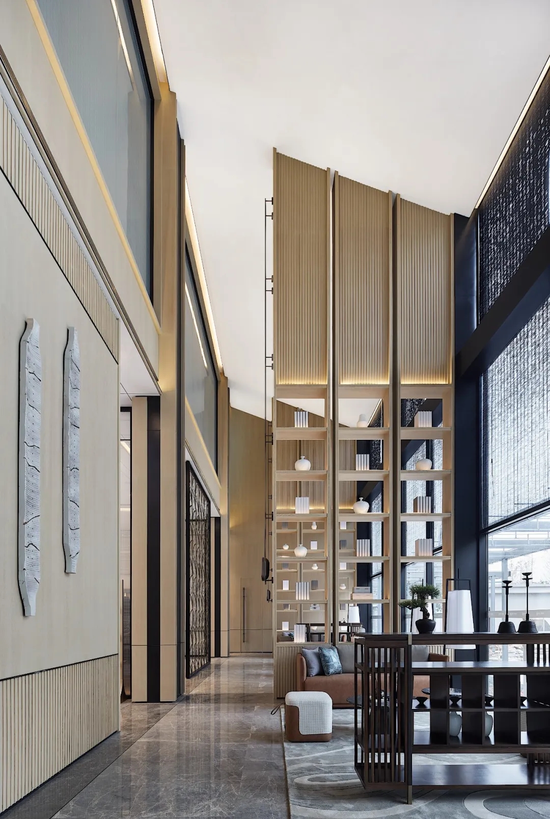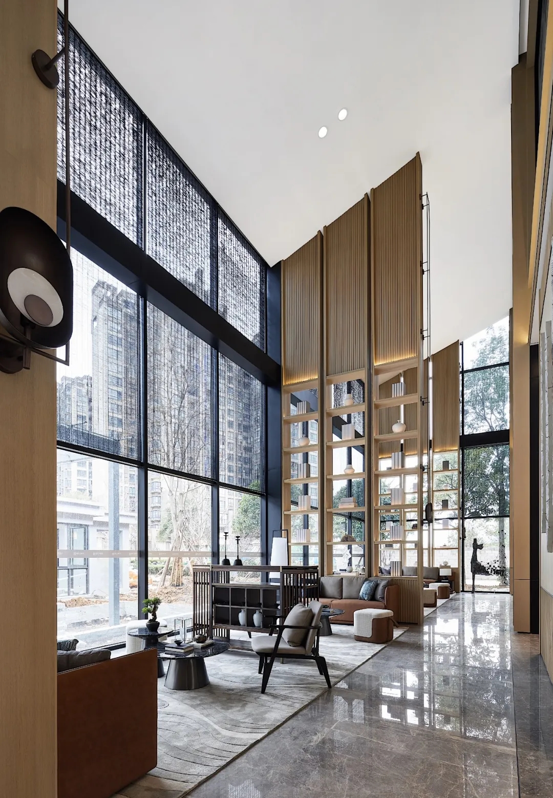 設(shè)計(jì)以暖調(diào)的木色統(tǒng)籌,縈繞其間的氛圍是美好而富有溫情的。墻上的掛件如扁舟淌水,窗旁的雨簾疏密有致,通高的木制書架銜接建筑天花形態(tài),縱向拉伸視覺效果。在這方雅座上沏杯清茶迎接來客,一同感受高雅曠達(dá)的自然人文情感。