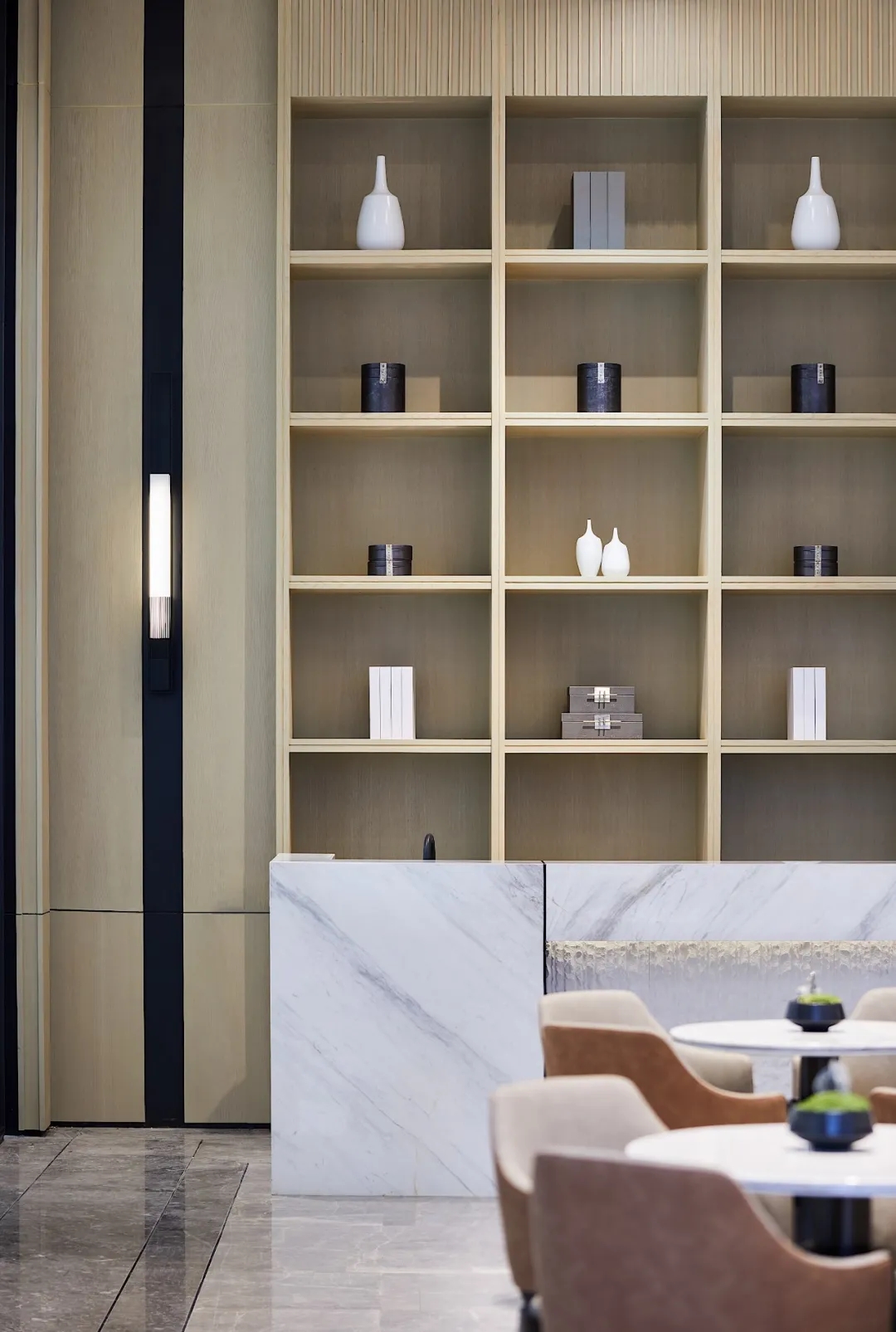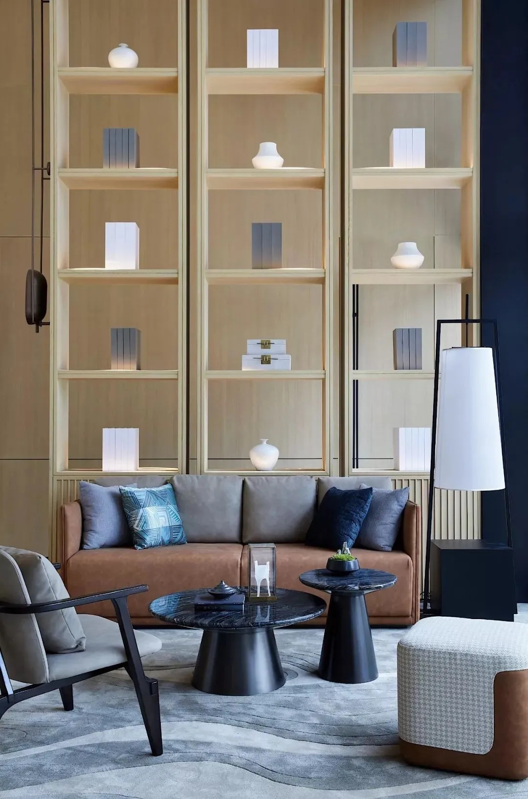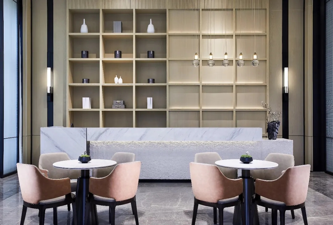 水吧區(qū)以粗糲與光滑相銜的材料搭建,材料豐富的表現(xiàn)力與層次感,在簡(jiǎn)雅的環(huán)境背景中被發(fā)揮到了極致?;诳臻g比例、功能使用、美學(xué)營(yíng)造等考慮,鴻藝源在設(shè)計(jì)中規(guī)避不必要的繁冗雜飾,只以數(shù)只清雅的瓶樽、輕盈的水晶吊燈與清冽的小處盆景裝點(diǎn),恰如這座城市予人的感覺一般,含蓄悠遠(yuǎn),閑適怡人。
