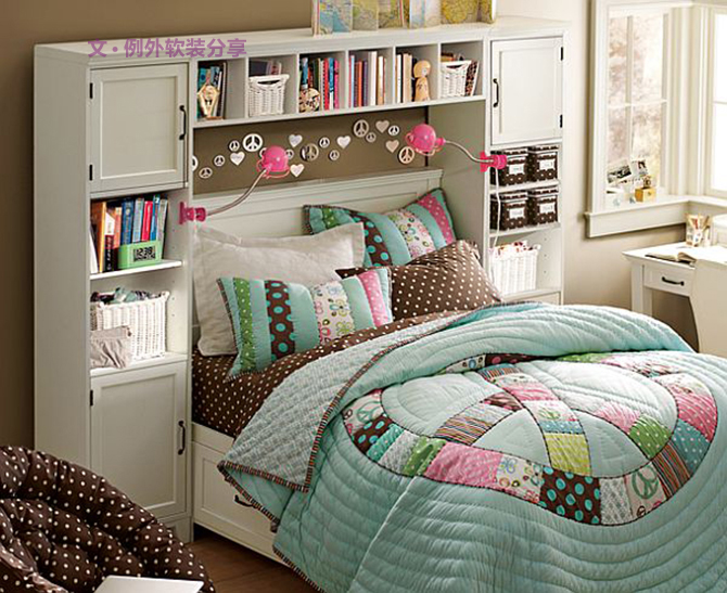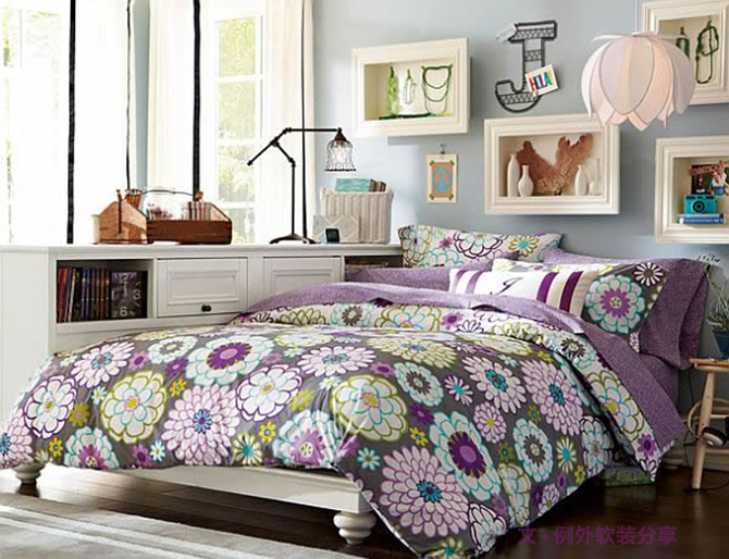種:灰色,白色,藍色的搭配看起來色調簡單清爽,有一點酷酷的感覺,比較適合運動型女孩;第二種:咖色,白色,粉色的搭配看起來像草莓巧克力,給人活潑甜美的感覺,如果女兒是一個開朗活潑的姑娘這類搭配她一定會喜歡;第三種:白色,粉藍色,咖色,粉紅色,顏色搭配繽紛豐富,粉藍文靜,粉紅俏皮,靠包與沙發上的原點裝飾顯得十分可愛討喜;第四種:咖色,鵝黃為主體,加入花色圖案元素,這一方案頓時讓人覺得溫暖明朗,墻繪與裝飾相結合的手法別有創意,值得借鑒;第五種:紫色,白色同樣加入花色圖案,由于以紫色為主體色調整個方案顯得浪漫許多,相信不少女孩都會很喜歡。
