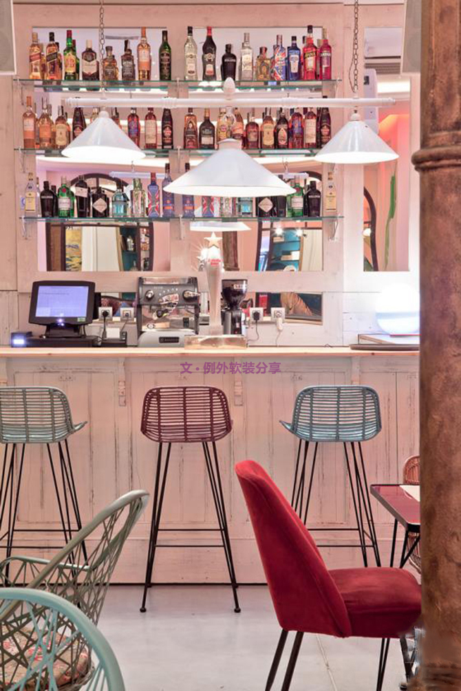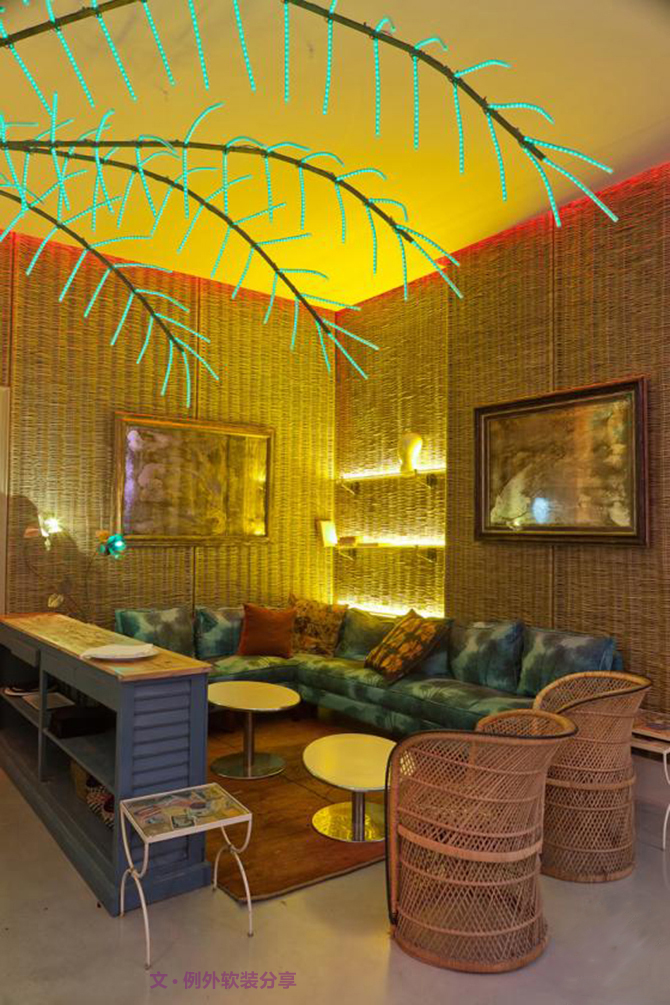 此外,獨特的飾品也為餐廳增色不少,棕櫚樹雕塑,掛著加勒比樣式的鐵鼓,在棕櫚樹葉子的掩蓋下,大部分的家具和配飾都是50年代的古董物件,比如從一艘舊船上搶救出來的桌子,編織鏤空座椅傳達出濃郁的熱帶風情,原始自然氣息。