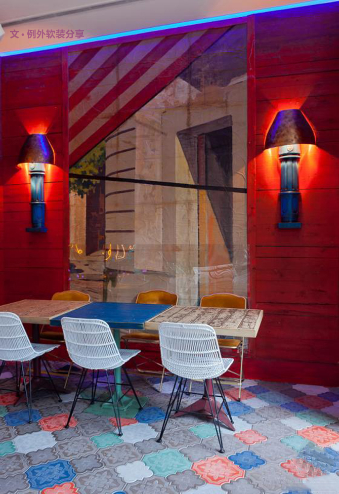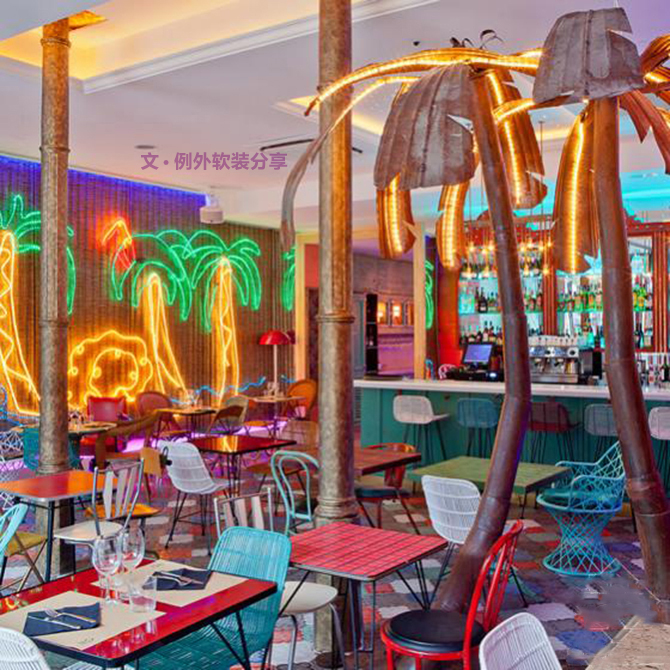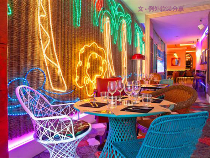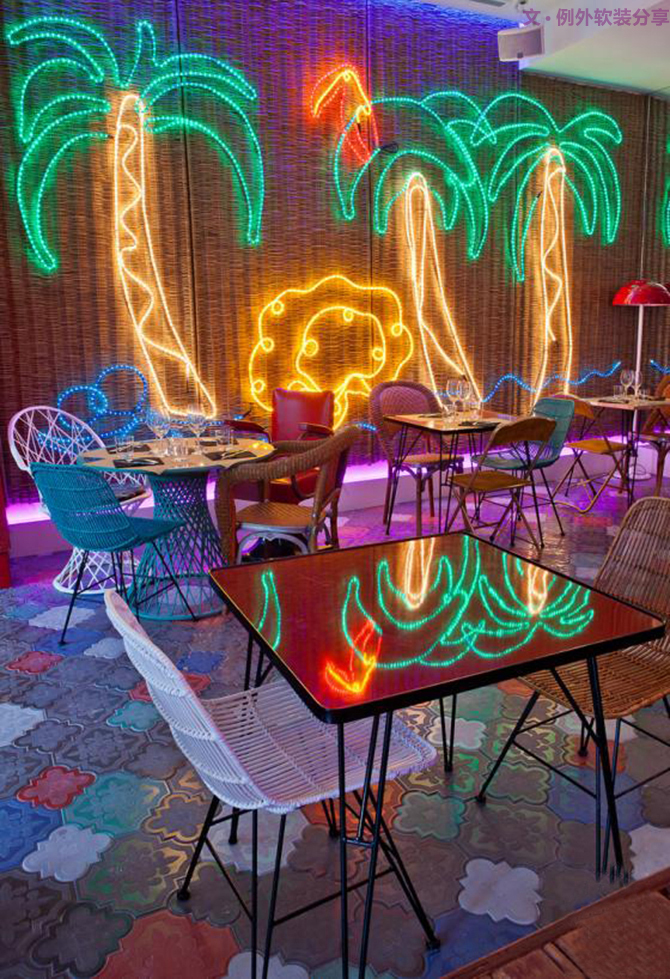 Bananas以椰子樹與芭蕉樹為主要元素,力求營造一種類似熱帶海濱小鎮(zhèn)的氛圍。餐廳墻壁上或手繪芭蕉葉子,墻上那只獵豹好像是在Blanca Ruiz de 別墅和Alejandra Basso的壁畫上穿梭捕食。或采用藤編工藝包裹墻面,或采用原生態(tài)木板飾面,各有特色,不盡相同,效果十分豐富。另一大亮點在于五彩繽紛的霓虹燈,將燈泡排列成棕櫚樹、海浪的形狀,鮮艷奪目的色彩為進餐帶來另類的新奇感受。