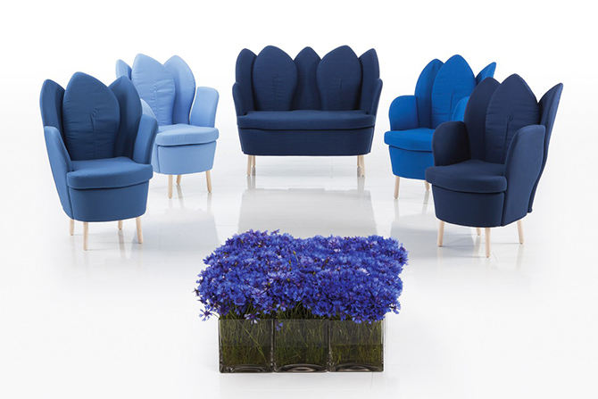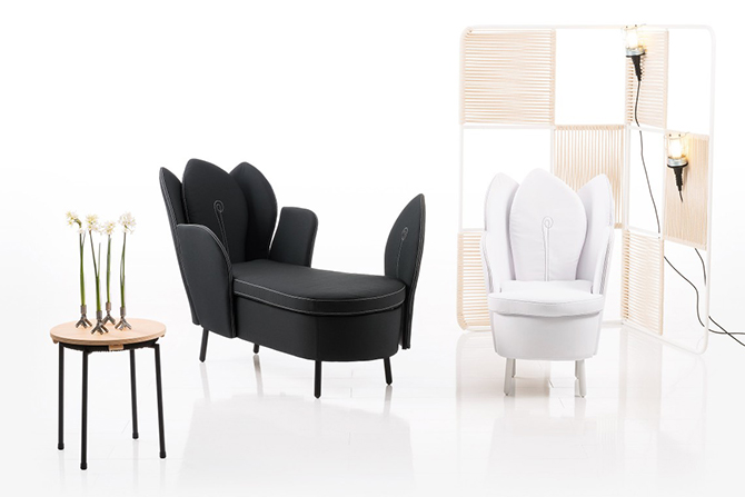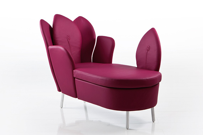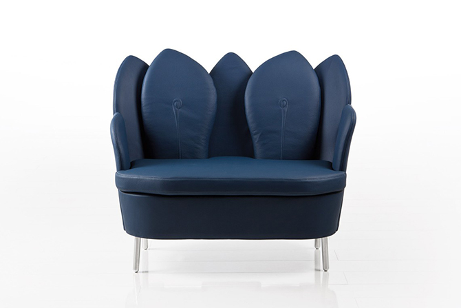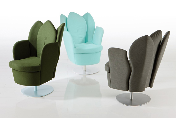 Morning Dew的特別之處就在于如重疊花瓣般的靠背,高高聳起的“花瓣”從各個角度為使用者提供支撐,并且具有可拆卸,可移動功能。細膩的紡織品或柔軟的皮革打造舒適的坐感,椅腿材質有天然櫸木、黑鉻或鋁質三種,單人沙發還有轉椅形制可供選擇。亮黃色的長榻與鋁質椅腳給人輕快的感覺,亮麗醒目,淺色沙發與木質椅腳搭配起來分外柔和,為空間的優雅加分。