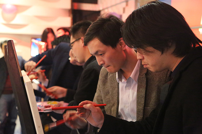 尤克里里的伴奏與Carmen女神的傾情獻(xiàn)唱把我們帶入一個無憂的童話世界,看另外一邊,硬裝設(shè)計部的其他同事們正在畫架前專注作畫呢!