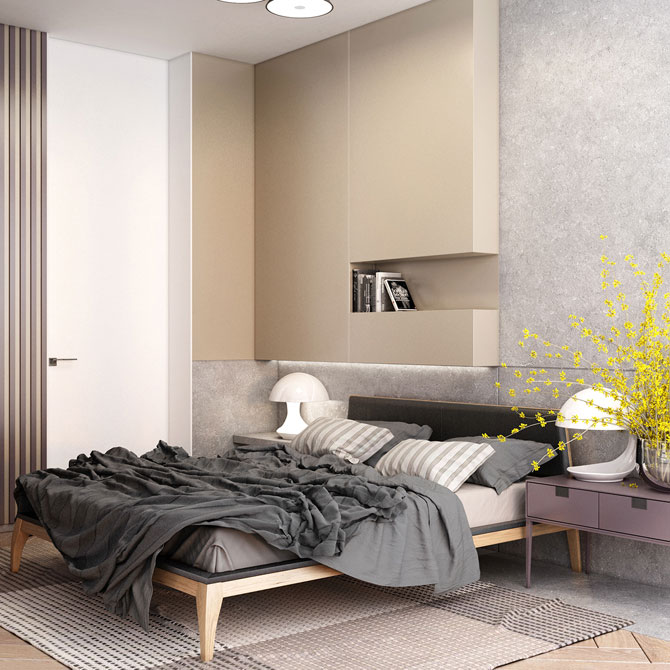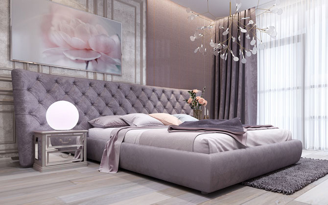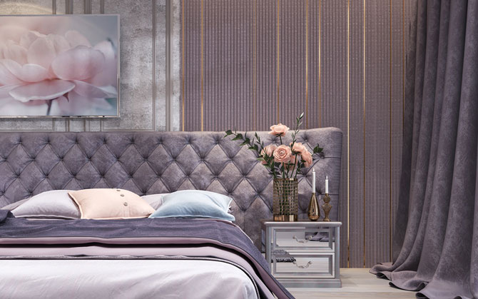 如果將灰紫色用于墻面,與床品更容易形成一個(gè)整體,空間感更強(qiáng)。