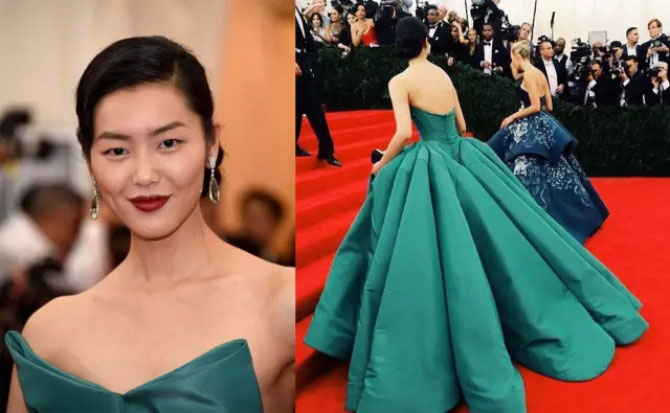 2014年Met Gala的紅毯上,劉雯著一身藍綠色禮服,被評為當年的best dress之一。