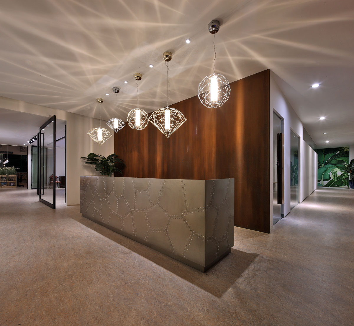 在室內設計中,過渡與呼應總是形影相伴的,具體到天花與地面、桌面與墻面、辦公家具之間……形體與色彩層次過渡自然、巧妙呼應的話,往往能取得意想不到的效果。