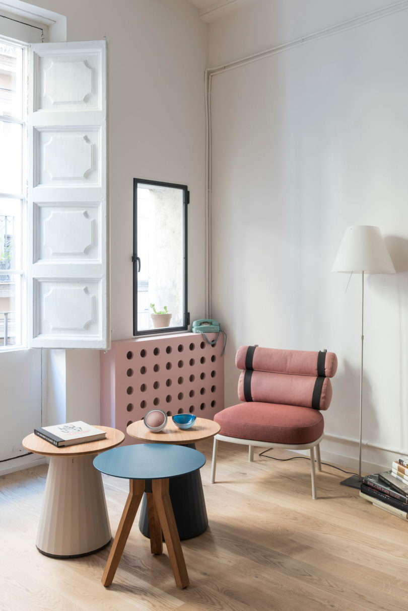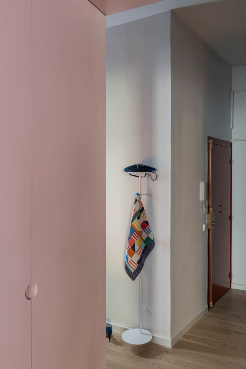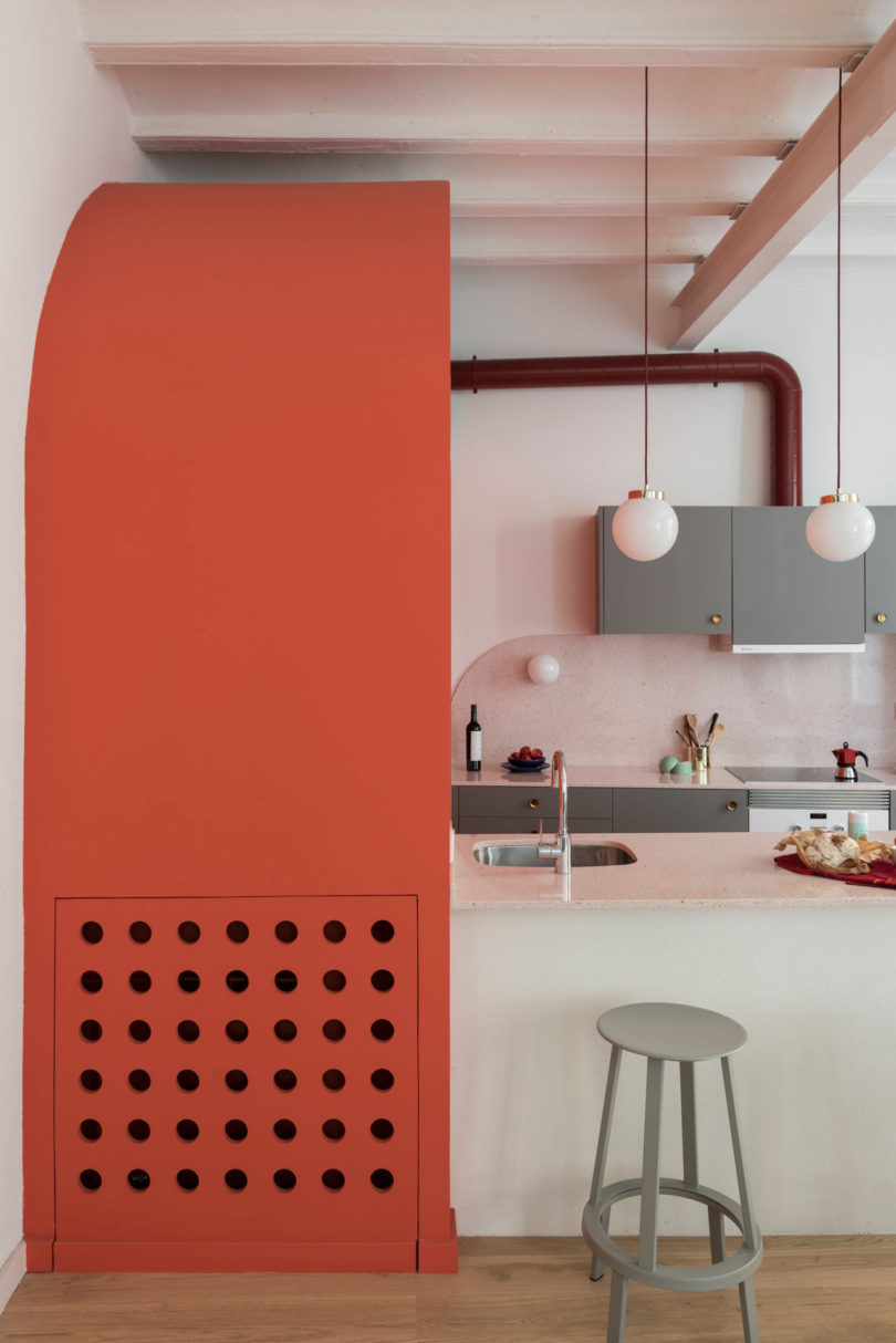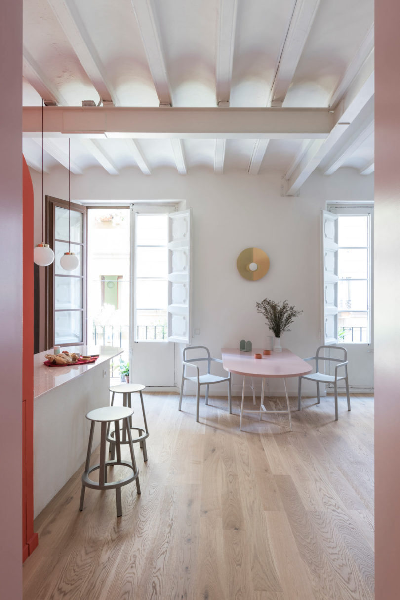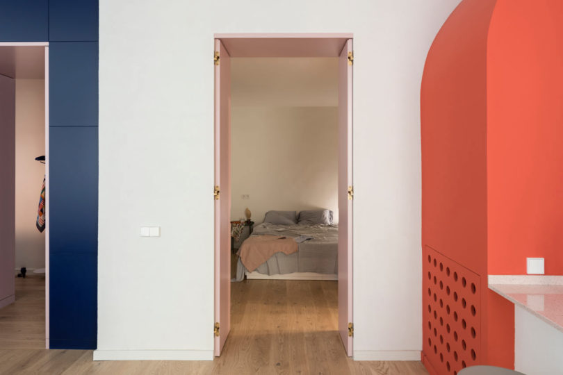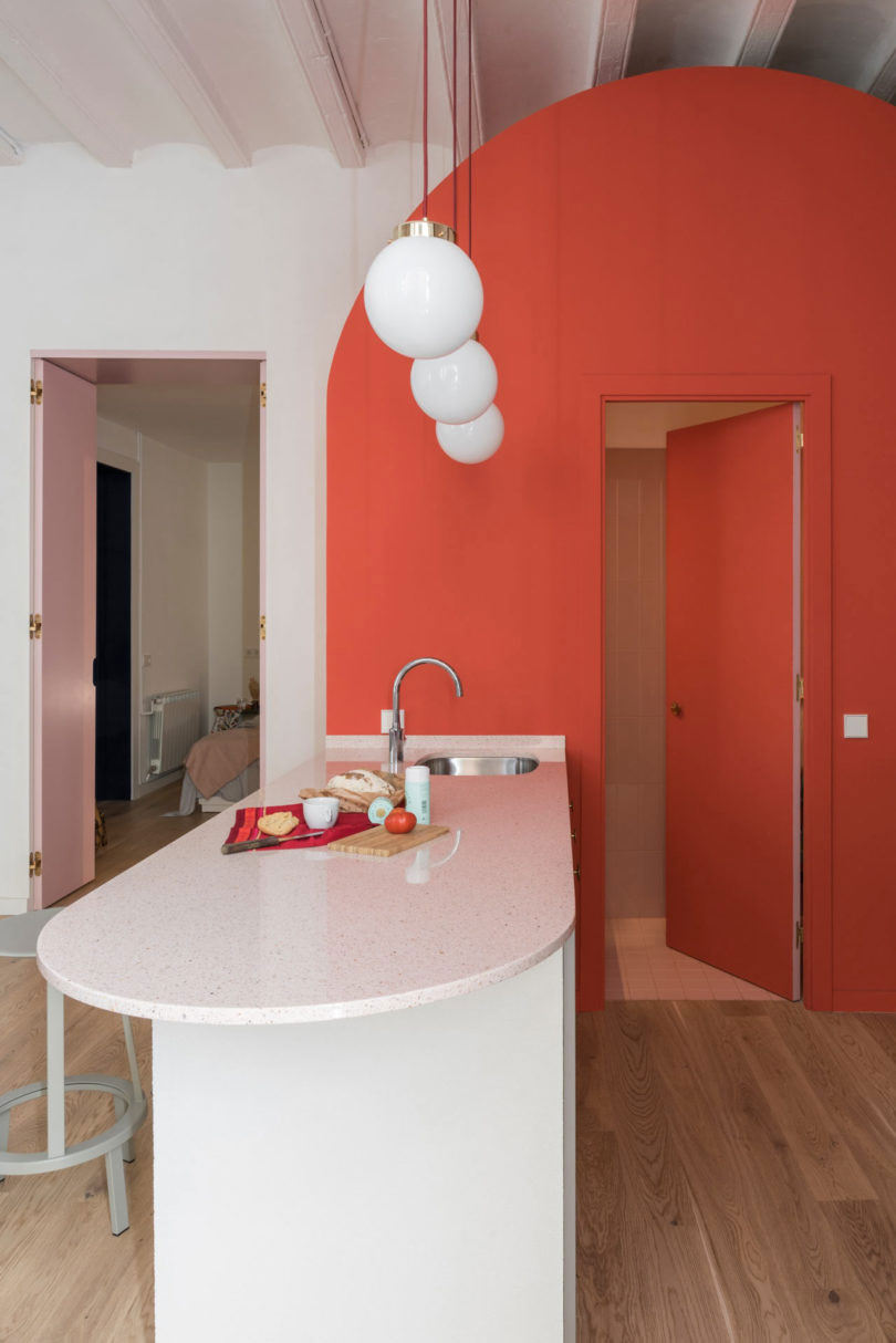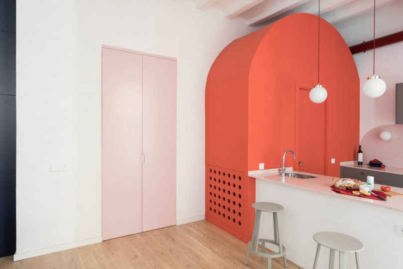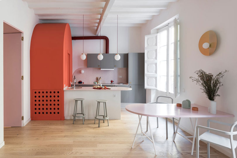 由于建筑本身具有大量的拱形元素,于是設(shè)計(jì)師在室內(nèi)添加了許多的拱形元素。例如天花和衛(wèi)生間,最吸睛的其實(shí)還是俏皮的空間配色??臻g以定制的新家具進(jìn)行呼應(yīng),加強(qiáng)新與舊的聯(lián)系。
