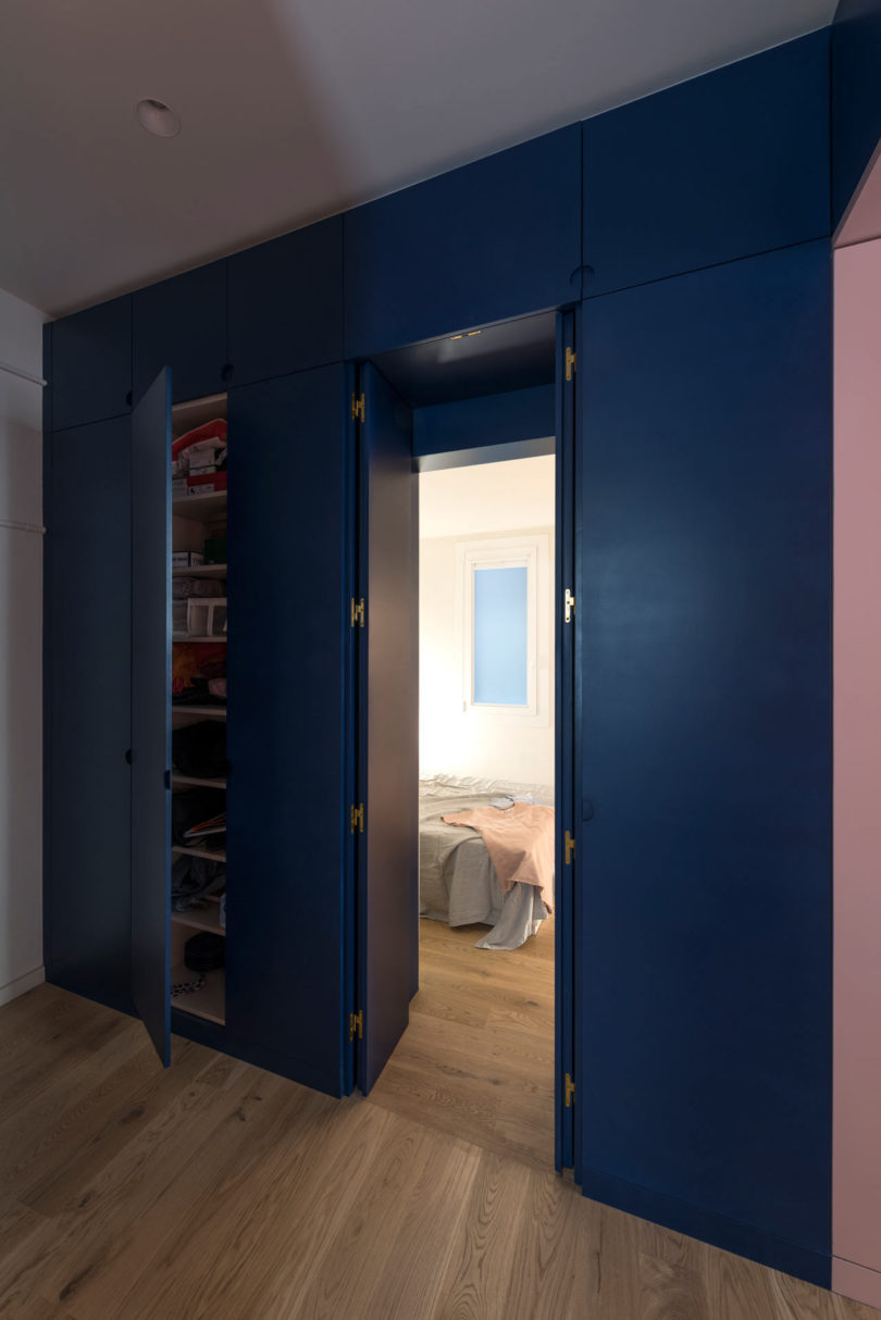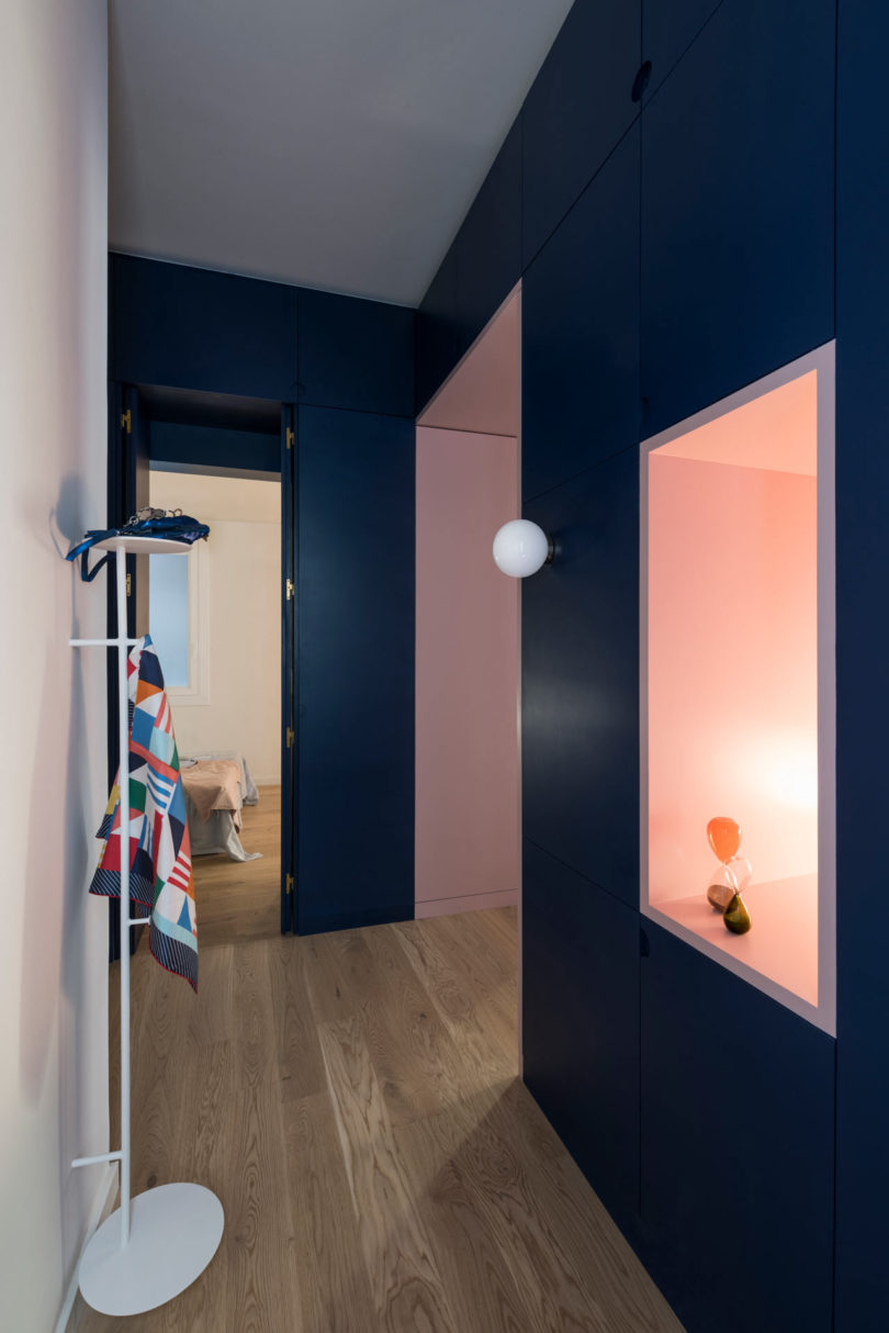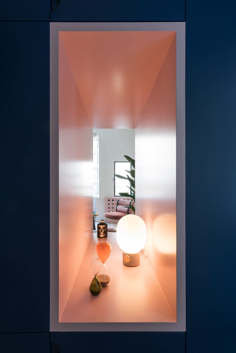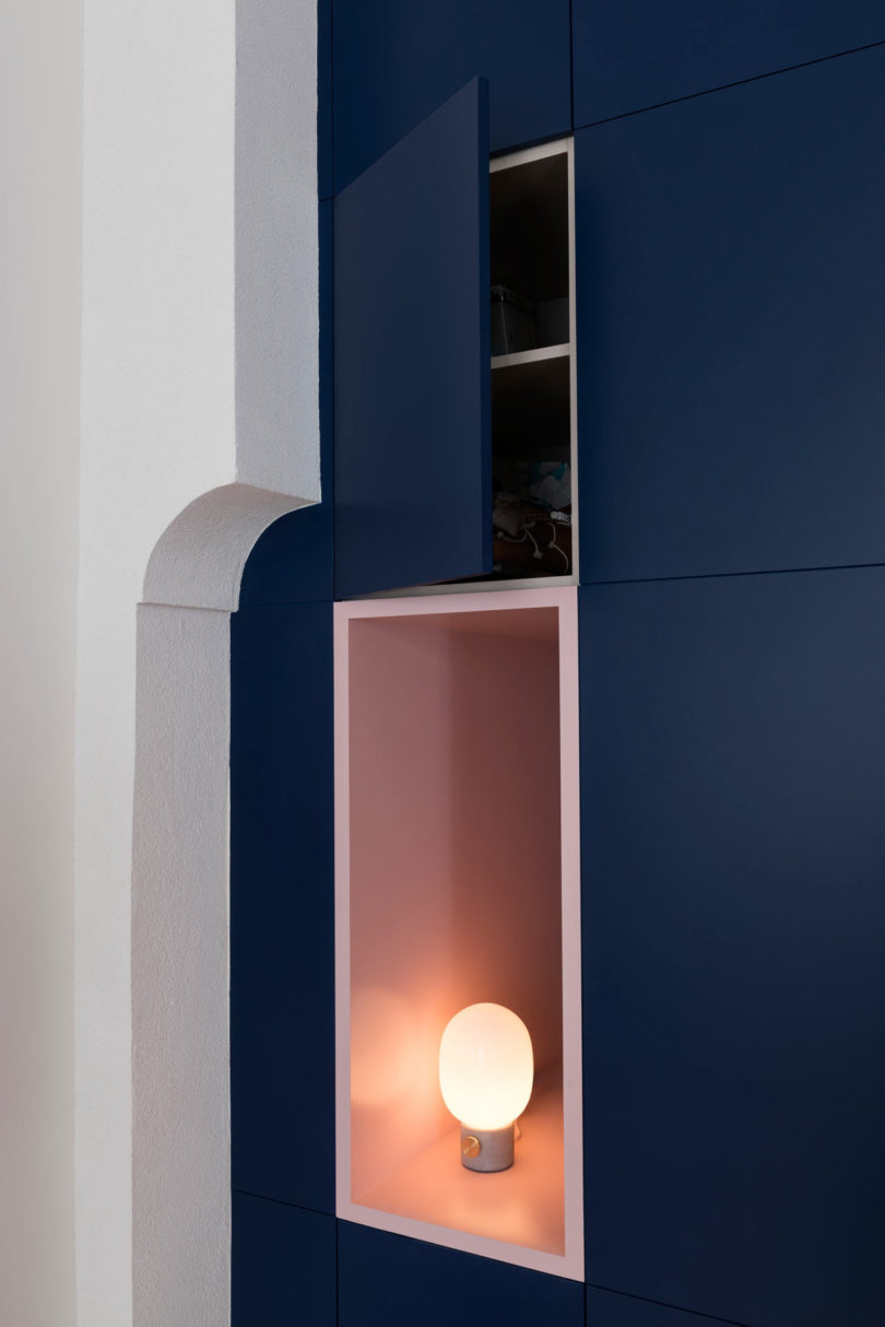 老建筑原有的采光不佳,為了增加采光,設(shè)計(jì)師做了許多有趣的改變,除了在外墻開(kāi)設(shè)門(mén)窗外,作為隔斷的柜體也被做出了通透的壁龕,擺放一盞燈,讓燈光與自然光線點(diǎn)亮原本昏暗的過(guò)道。