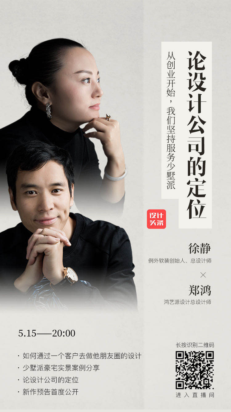 5月15日晚8點,鴻藝源設計鄭鴻先生和徐靜女士將帶來他們的直播首秀,和大家分享15年來堅持服務少墅派的故事,同時還會慷慨分享設計公司該如何定位才能更好發展的秘訣,大家不要錯過哦!